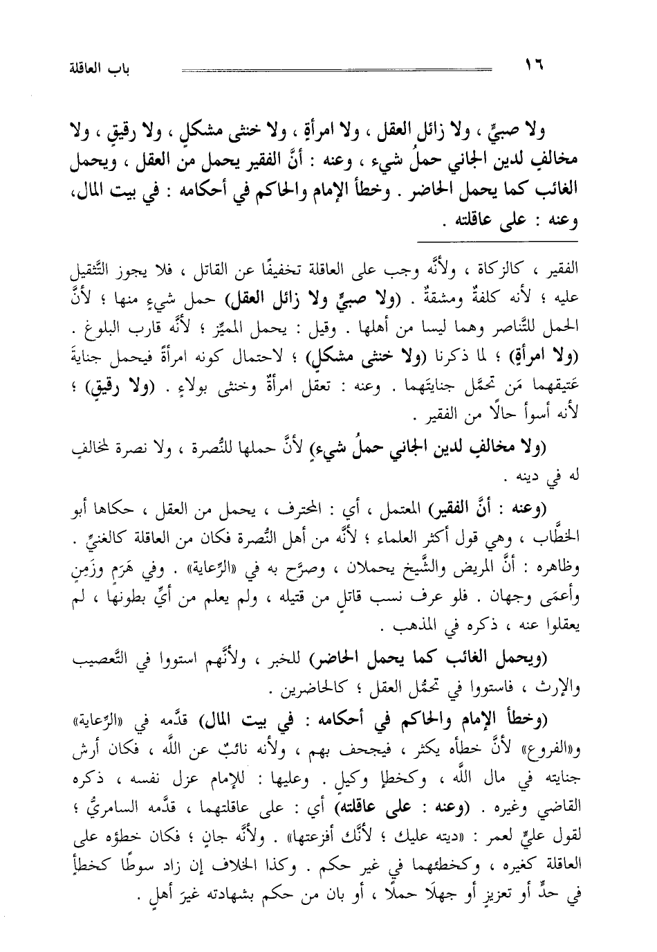 الفقير كالزكاة ولأنه وجب على العاقلة تخفيفا عن القاتل فلا يجوز التثقيل عليه لأنه كلفة ومشقة "ولا صبي ولا زائل العقل" حمل شيء منها لأن الحمل للتناصر وهما ليسا من أهلها وقيل يحمل المميز لأنه قارب البلوغ ولا امرأة لما ذكرنا "ولا خنثى مشكل" لاحتمال كونه امرأة فيحمل جناية عتيقهما من تحمل جنايتهما وعنه تعقل امرأة وخنثى بولاء ولا رقيق لأنه أسوأ حالا من الفقير.