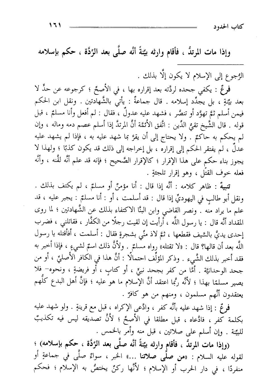 فرع: يكفي جحده لردته بعد إقراره بها في الأصح كرجوعه عن حد لا بعد بينة بل يجدد إسلامه قال جماعة يأتي بالشهادتين ونقل ابن الحكم فيمن أسلم ثم تهود أو تنصر فشهد عليه عدول فقال لم أفعل وأنا مسلم قبل قوله قال الشيخ تقي الدين اتفق الأئمة أن المرتد إذا أسلم عصم دمه وماله وإن لم يحكم به حاكم ولا يحتاج إلى أن يقر بما شهد عليه به فإذا لم يشهد عليه عدل لم يفتقر الحكم إلى إقراره بل إخراجه إلى ذلك قد يكون كذبا ولهذا لا يجوز بناء حكم على هذا الإقرار كالإقرار الصحيح فإنه قد علم أنه لقنه وأنه فعله خوف القتل وهو إقرار تلجئه