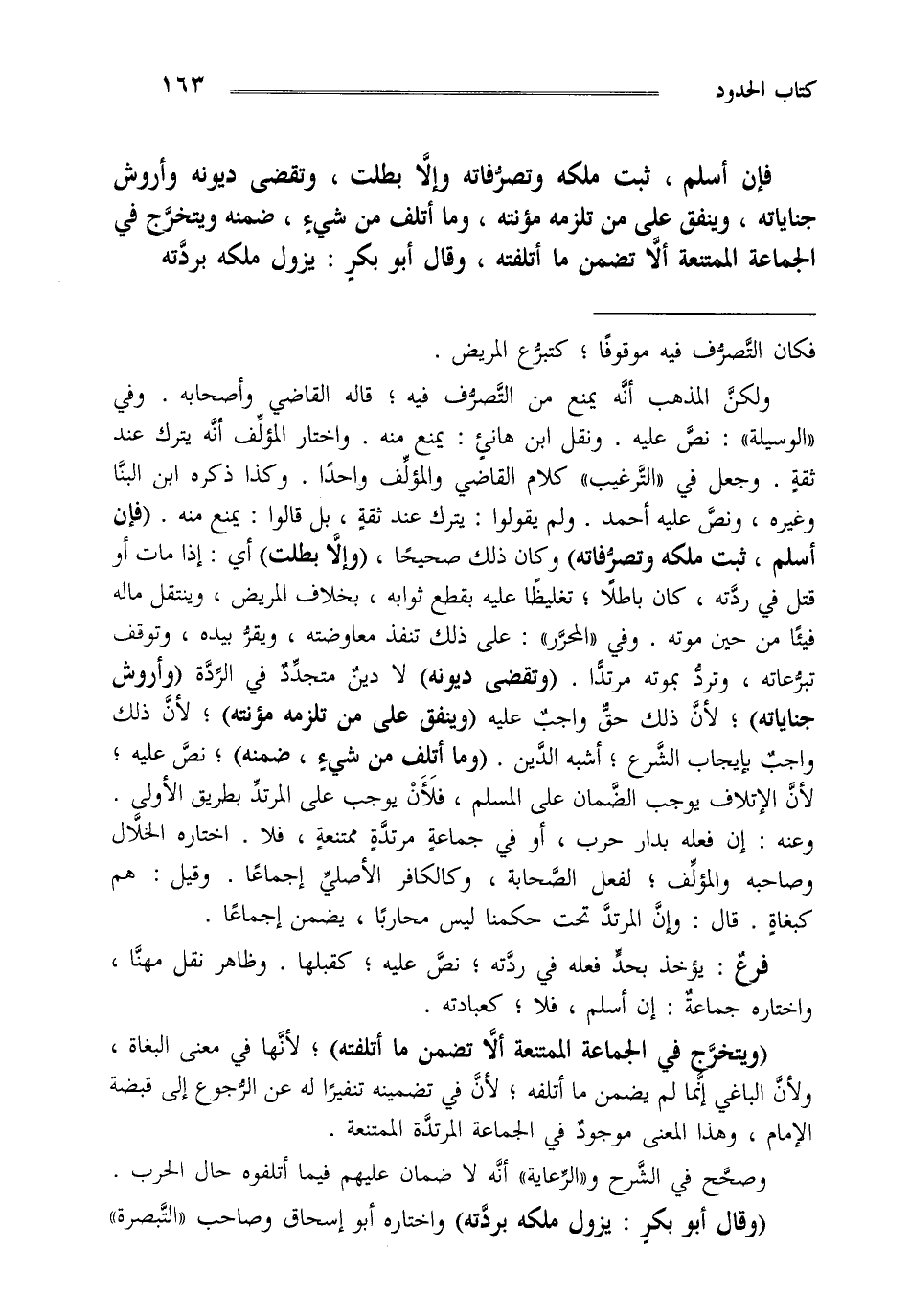 فرع: يؤخذ بحد فعله في ردته نص عليه كقبلها وظاهر نقل مهنا واختاره جماعة إن أسلم فلا كعبادته "ويتخرج في الجماعة الممتنعة ألا تضمن ما أتلفته" لأنها في معنى البغاة ولأن الباغي إنما لم يضمن ما أتلفه لأن في تضمينه تنفيرا له عن الرجوع إلى قبضة الإمام وهذا المعنى موجود في الجماعة المرتدة الممتنعة