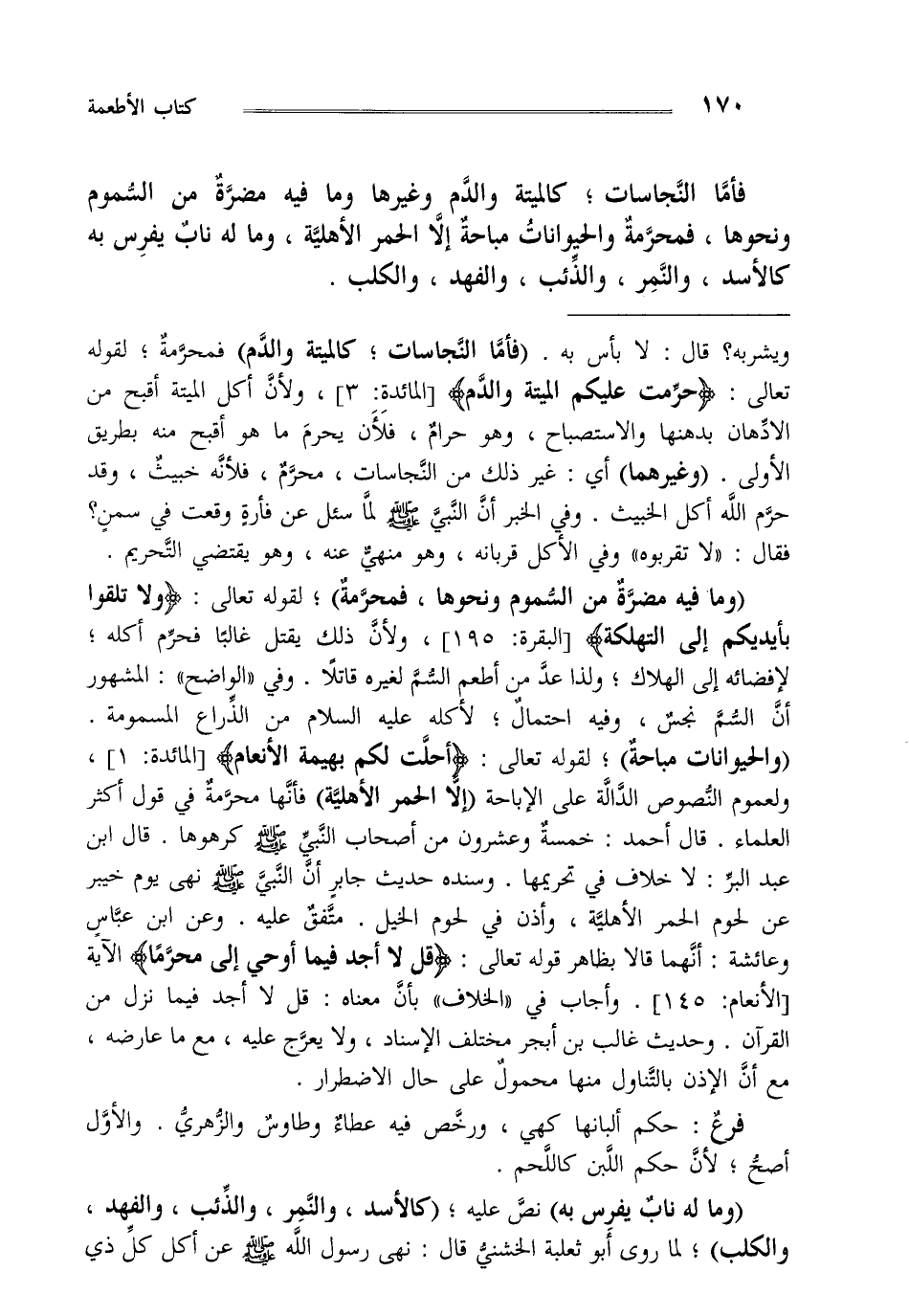 فأما النجاسات كالميتة والدم وغيرها وما فيه مضرة من السموم ونحوها فمحرمة والحيوانات مباحة إلا الحمر الأهلية وما له ناب يفرس به كالأسد والنمر والذئب والفهد والكلب.