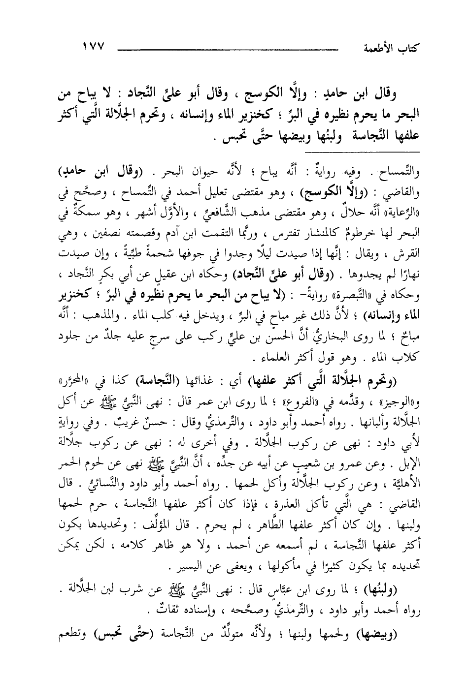 وقال ابن حامد وإلا الكوسج وقال أبو علي النجاد لا يباح من البحر ما يحرم نظيره في البر كخنزير الماء وإنسانه وتحرم الجلالة التي أكثر علفها النجاسة ولبنها وبيضها حتى تحبس