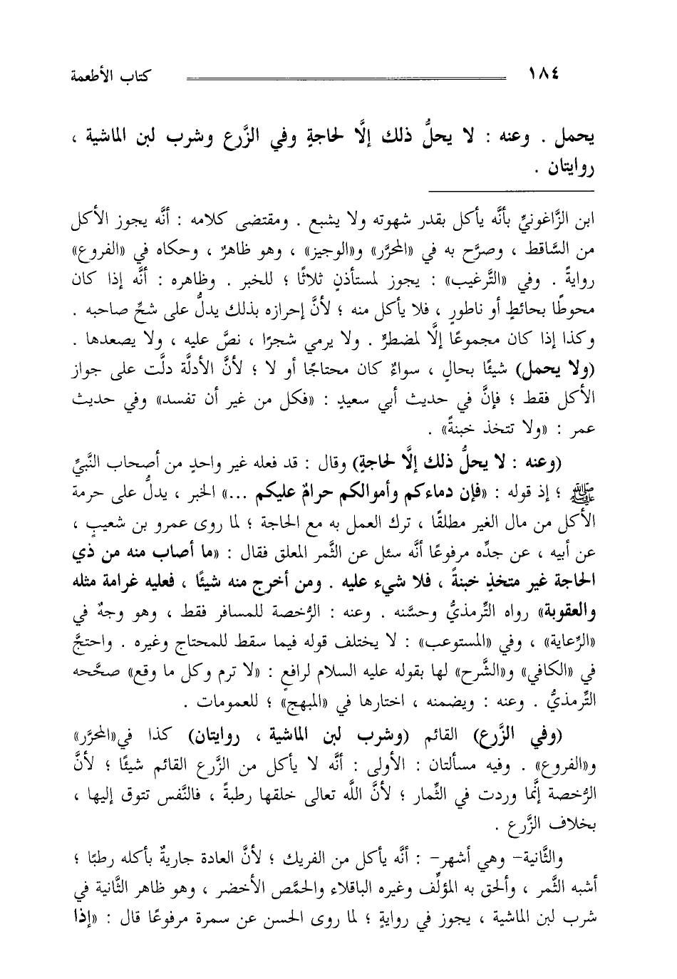 "وفي الزرع" القائم "وشرب لبن الماشية روايتان" كذا في المحرر والفروع وفيه مسألتان: الأولى أنه لا يأكل من الزرع القائم شيئا لأن الرخصة إنما وردت في الثمار لأن الله تعالى خلقها رطبة فالنفس تتوق إليها بخلاف الزرع