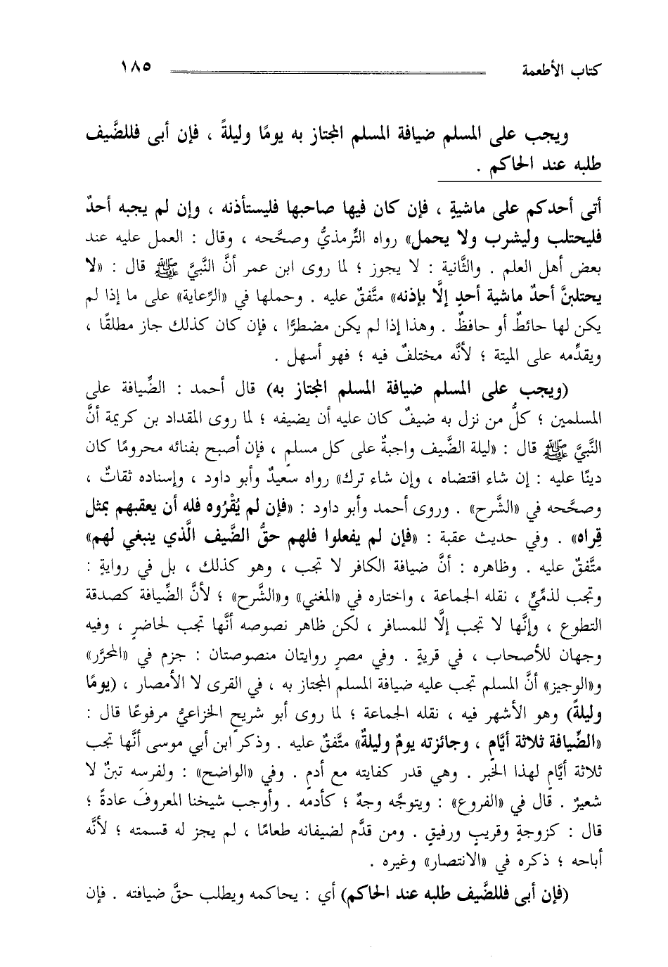 "ويجب على المسلم ضيافة المسلم المجتاز به" قال أحمد الضيافة على المسلمين كل من نزل به ضيف كان عليه أن يضيفه لما روى المقداد بن كريمة أن النبي صلى الله عليه وسلم قال "ليلة الضيف واجبة على كل مسلم فإن أصبح بفنائه محروما كان دينا عليه إن شاء اقتضاه وإن شاء ترك" رواه سعيد وأبو داود وإسناده ثقات وصححه في الشرح وروى أحمد وأبو داود "فإن لم يقروه فله أن يعقبهم بمثل قراه" وفي حديث عقبة "فإن لم يفعلوا فلهم حق الضيف الذي ينبغي لهم" متفق عليه وظاهره أن ضيافة الكافر لا تجب وهو كذلك بل في رواية وتجب لذمي نقله الجماعة واختاره في المغني والشرح لأن الضيافة كصدقة التطوع وإنها لا تجب إلا للمسافر لكن ظاهر نصوصه أنها تجب لحاضر وفيه وجهان للأصحاب في قرية وفي مصر روايتان منصوصتان جزم في المحرر والوجيز أن المسلم تجب عليه ضيافة المسلم المجتاز به في القرى لا الأمصار "يوما وليلة" وهو الأشهر فيه نقله الجماعة لما روى أبو شريح الخزاعي مرفوعا قال "الضيافة ثلاثة أيام وجائزته يوم وليلة" متفق عليه وذكر ابن أبي موسى أنها تجب ثلاثة أيام لهذا الخبر وهي قدر كفايته مع أدم وفي الواضح ولفرسه تبن لا شعير قال في الفروع ويتوجه وجه كأدمه وأوجب شيخنا المعروف عادة قال كزوجة وقريب ورفيق ومن قدم لضيفانه طعاما لم يجز له قسمته لأنه أباحه ذكره في الانتصار وغيره