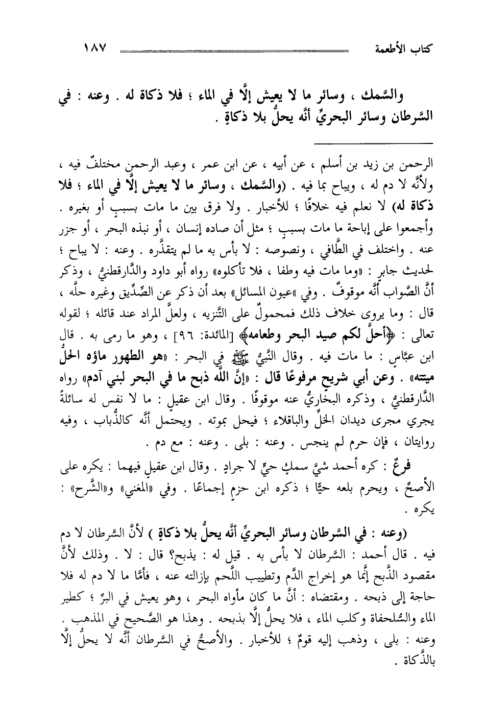 الرحمن بن زيد بن أسلم عن أبيه عن ابن عمر وعبد الرحمن مختلف فيه ولأنه لا دم له ويباح بما فيه "والسمك وسائر ما لا يعيش إلا في الماء فلا ذكاة له" لا نعلم فيه خلافا للأخبار ولا فرق بين ما مات بسبب أو بغيره وأجمعوا على إباحة ما مات بسبب مثل أن صاده إنسان أو نبذه البحر أو جزر عنه واختلف في الطافي ونصوصه لا بأس به ما لم يتقذره وعنه لا يباح لحديث جابر وما مات فيه وطفا فلا تأكلوه رواه أبو داود والدارقطني وذكر أن الصواب أنه موقوف وفي عيون المسائل بعد أن ذكر عن الصديق وغيره حله قال وما يروى خلاف ذلك فمحمول على التنزيه ولعل المراد عند قائله لقوله تعالى {أُحِلَّ لَكُمْ صَيْدُ الْبَحْرِ وَطَعَامُهُ} [المائدة: 96] وهو ما رمى به قال ابن عباس ما مات فيه وقال النبي صلى الله عليه وسلم في البحر "هو الطهور ماؤه الحل ميتته" وعن أبي شريح مرفوعا قال "إن الله ذبح ما في البحر لبني آدم" رواه الدارقطني وذكره البخاري عنه موقوفا وقال ابن عقيل ما لا نفس له سائلة يجري مجرى ديدان الخل والباقلاء فيحل بموته ويحتمل أنه كالذباب وفيه روايتان فإن حرم لم ينجس وعنه بلى وعنه مع دم
