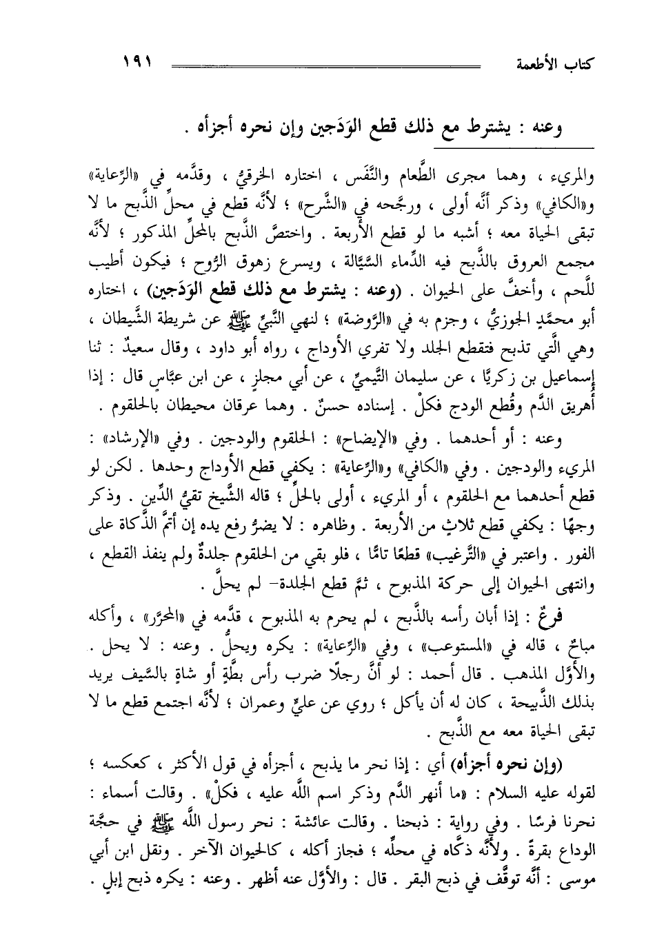 وعنه أو أحدهما وفي الإيضاح الحلقوم والودجين وفي الإرشاد المريء والودجين وفي الكافي والرعاية يكفي قطع الأوداج وحدها لكن لو قطع أحدهما مع الحلقوم أو المريء أولى بالحل قاله الشيخ تقي الدين وذكر وجها يكفي قطع ثلاث من الأربعة وظاهره لا يضر رفع يده إن أتم الذكاة على الفور واعتبر في الترغيب قطعا تاما فلو بقي من الحلقوم جلدة ولم ينفذ القطع وانتهى الحيوان إلى حركة المذبوح ثم قطع الجلدة لم يحل