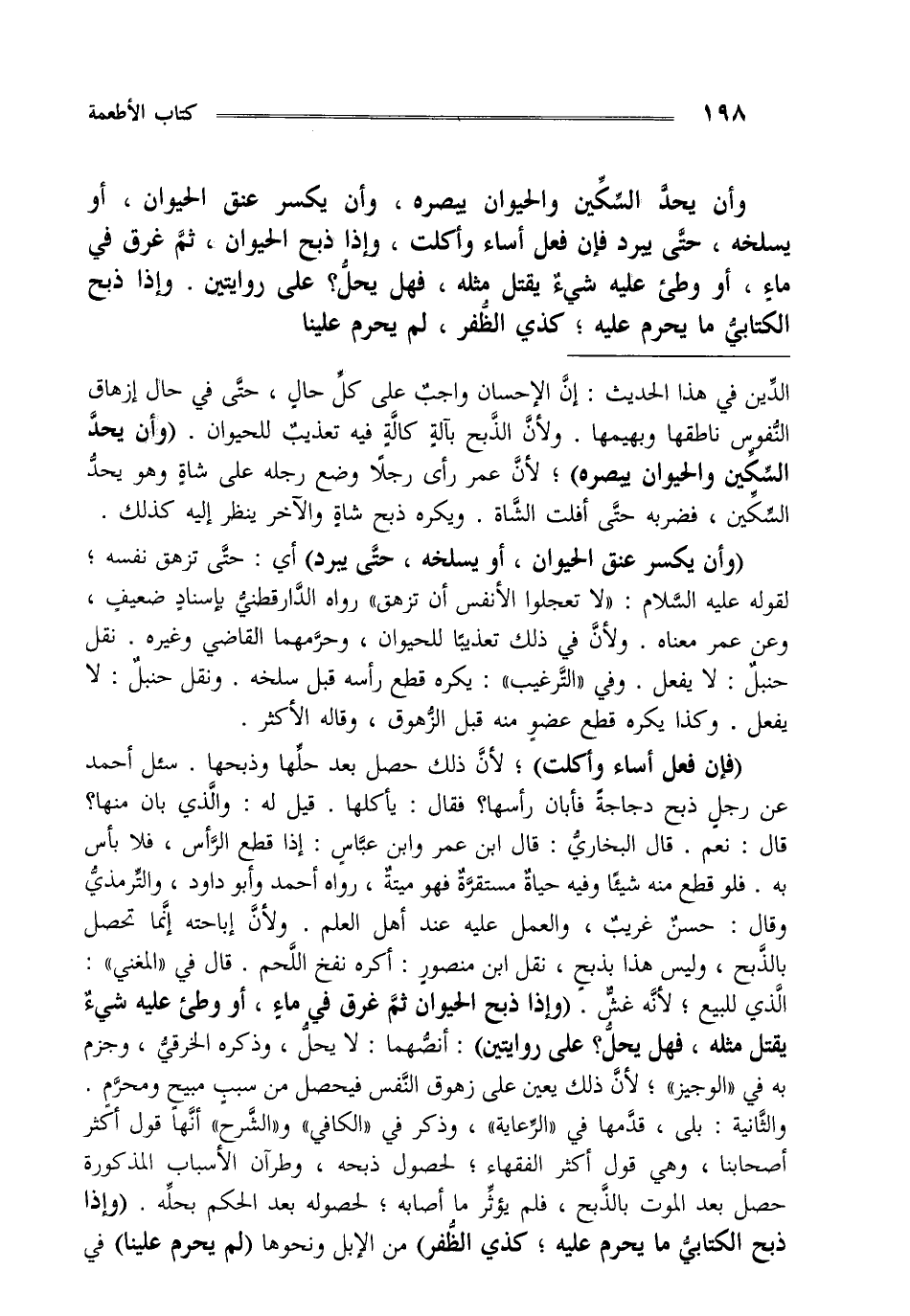 وأن يحد السكين والحيوان يبصره وأن يكسر عنق الحيوان أو يسلخه حتى يبرد فإن فعل أساء وأكلت وإذا ذبح الحيوان ثم غرق في ماء أو وطئ عليه شيء يقتل مثله فهل يحل على روايتين وإذا ذبح الكتابي ما يحرم عليه كذي الظفر لم يحرم علينا