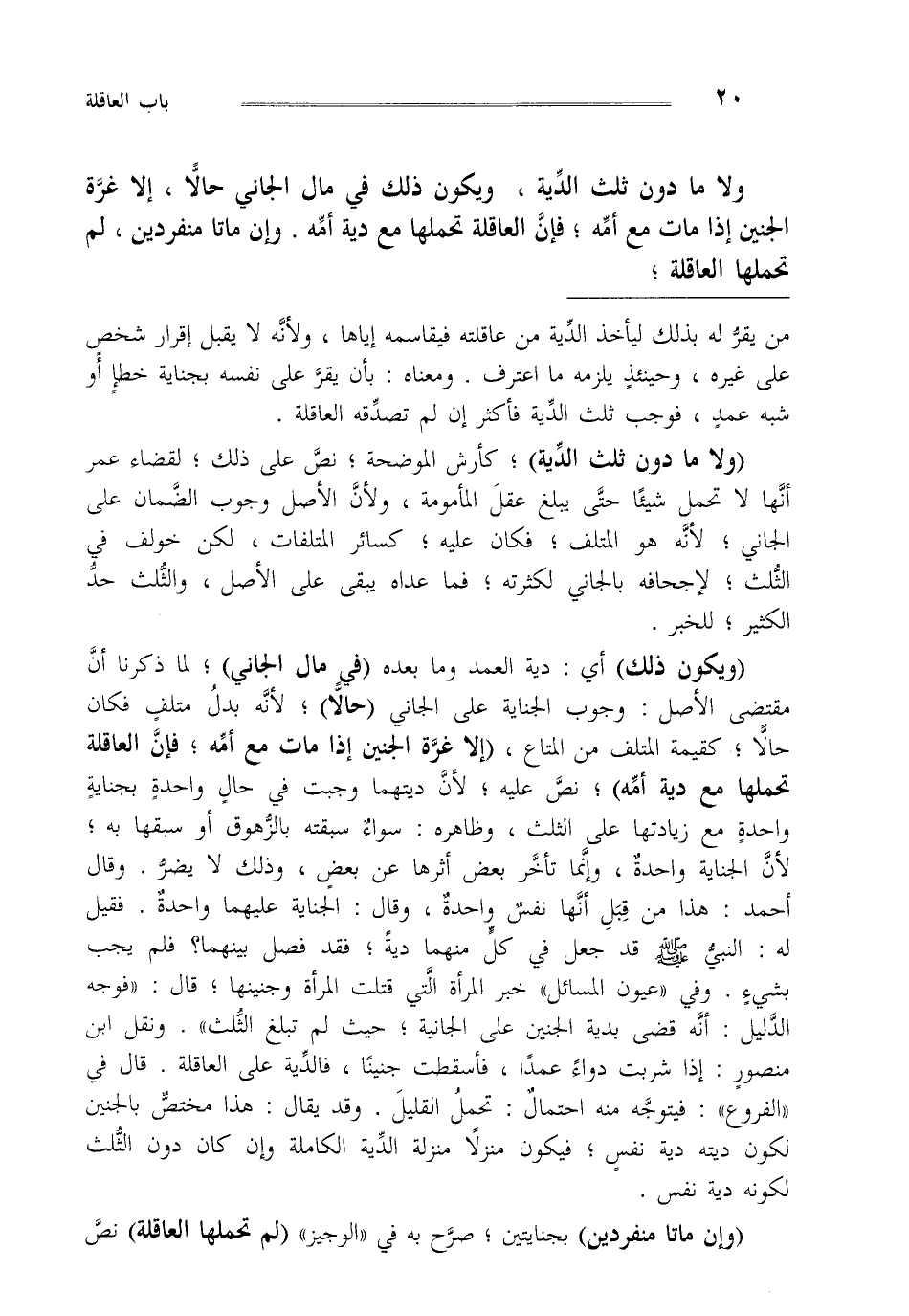 "ولا ما دون ثلث الدية" كأرش الموضحة نص على ذلك لقضاء عمر أنها لا تحمل شيئا حتى يبلغ عقل المأمومة ولأن الأصل وجوب الضمان على الجاني لأنه هو المتلف فكان عليه كسائر المتلفات لكن خولف في الثلث لإجحافه بالجاني لكثرته فما عداه يبقى على الأصل والثلث حد الكثير للخبر "ويكون ذلك" أي دية العمد وما بعده "في مال الجاني" لما ذكرنا أن مقتضى الأصل وجوب الجناية على الجاني "حالا" لأنه بدل متلف فكان حالا كقيمة المتلف من المتاع طإلا غرة الجنين إذا مات مع أمه" فإن العاقلة تحملها مع دية أمه نص عليه لأن ديتهما وجبت في حال واحدة بجناية واحدة مع زيادتها على الثلث وظاهره سواء سبقته بالزهوق أو سبقها به لأن الجناية واحدة وإنما تأخر بعض أثرها عن بعض وذلك لا يضر وقال أحمد هذا من قبل أنها نفس واحدة وقال الجناية عليهما واحدة فقيل له النبي صلى الله عليه وسلم قد جعل في كل منهما دية فقد فصل بينهما فلم يجب بشيء وفي عيون المسائل خبر المرأة التي قتلت المرأة وجنينها قال فوجه الدليل أنه قضى بدية الجنين على الجانية حيث لم تبلغ الثلث ونقل ابن منصور إذا شربت دواء عمدا فأسقطت جنينا فالدية على العاقلة قال في الفروع فيتوجه منه احتمال تحمل القليل وقد يقال هذا مختص بالجنين لكونه ديته دية نفس فيكون منزلا منزلة الدية الكاملة و إن كان دون الثلث لكونه دية نفس.