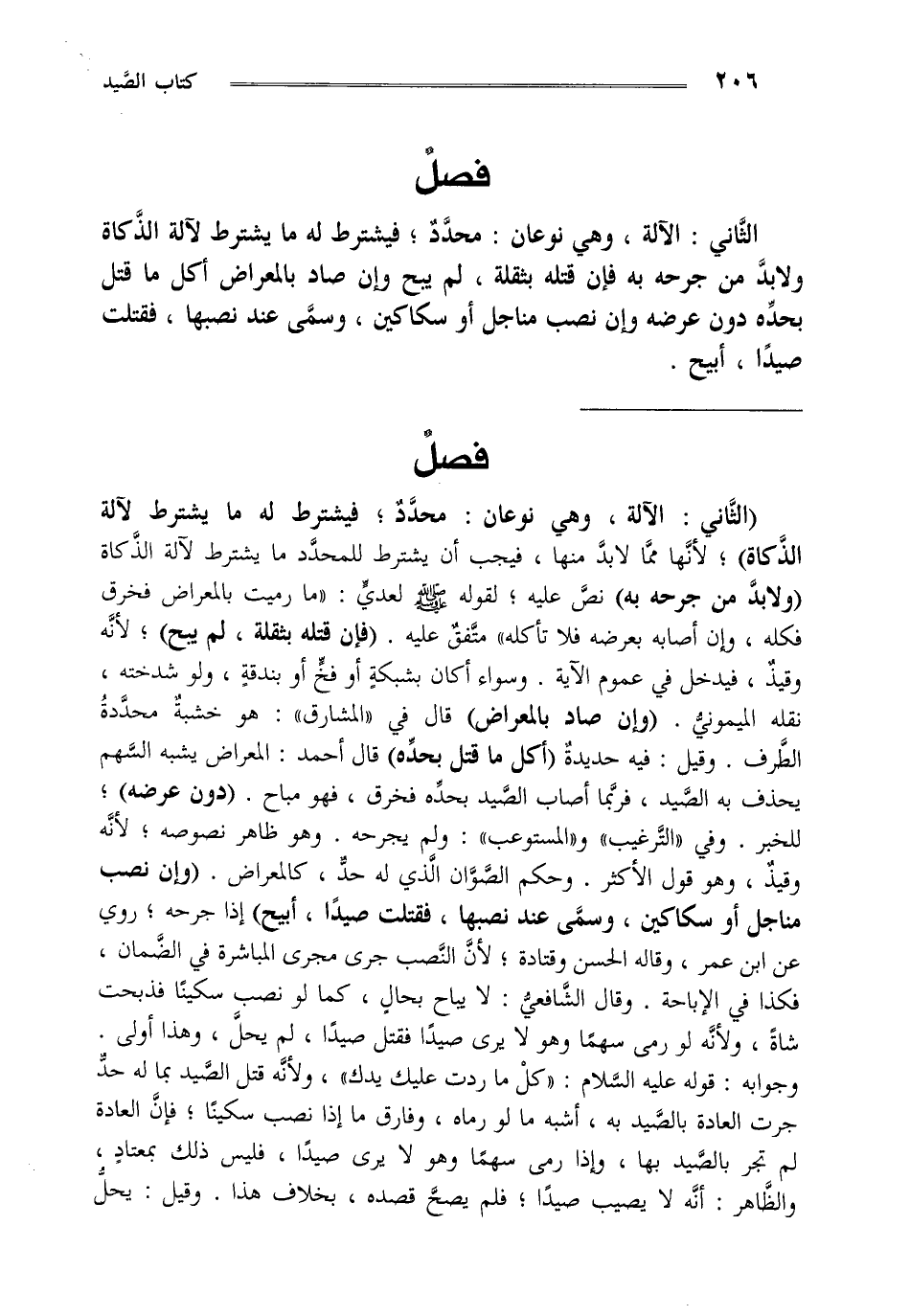 الثاني: الآلة وهي نوعان: محدد فيشترط له ما يشترط لآلة الذكاة ولا بد من جرحه به فإن قتله بثقلة لم يبح وإن صاد بالمعراض أكل ما قتل بحده دون عرضه وإن نصب مناجل أو سكاكين وسمى عند نصبها فقتلت صيدا أبيح