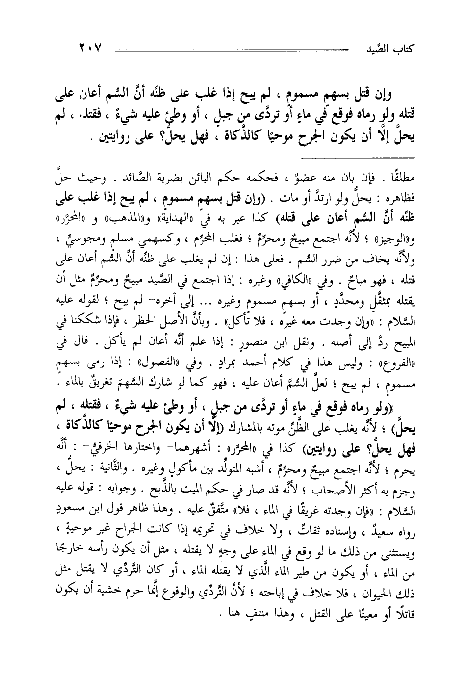 مطلقا فإن بان منه عضو فحكمه حكم البائن بضربة الصائد وحيث حل فظاهره يحل ولو ارتد أو مات "وإن قتل بسهم مسموم لم يبح إذا غلب على ظنه أن السم أعان على قتله" كذا عبر به في الهداية والمذهب والمحرر والوجيز لأنه اجتمع مبيح ومحرم فغلب المحرم وكسهمي مسلم ومجوسي ولأنه يخاف من ضرر السم فعلى هذا إن لم يغلب على ظنه أن السم أعان على قتله فهو مباح وفي الكافي وغيره إذا اجتمع في الصيد مبيح ومحرم مثل أن يقتله بمثقل ومحدد أو بسهم مسموم وغيره إلى آخره لم يبح لقوله عليه السلام "وإن وجدت معه غيره فلا تأكل" وبأن الأصل الحظر فإذا شككنا في المبيح رد إلى أصله ونقل ابن منصور إذا علم أنه أعان لم يأكل قال في الفروع وليس هذا في كلام أحمد بمراد وفي الفصول إذا رمى بسهم مسموم لم يبح لعل السم أعان عليه فهو كما لو شارك السهم تغريق بالماء