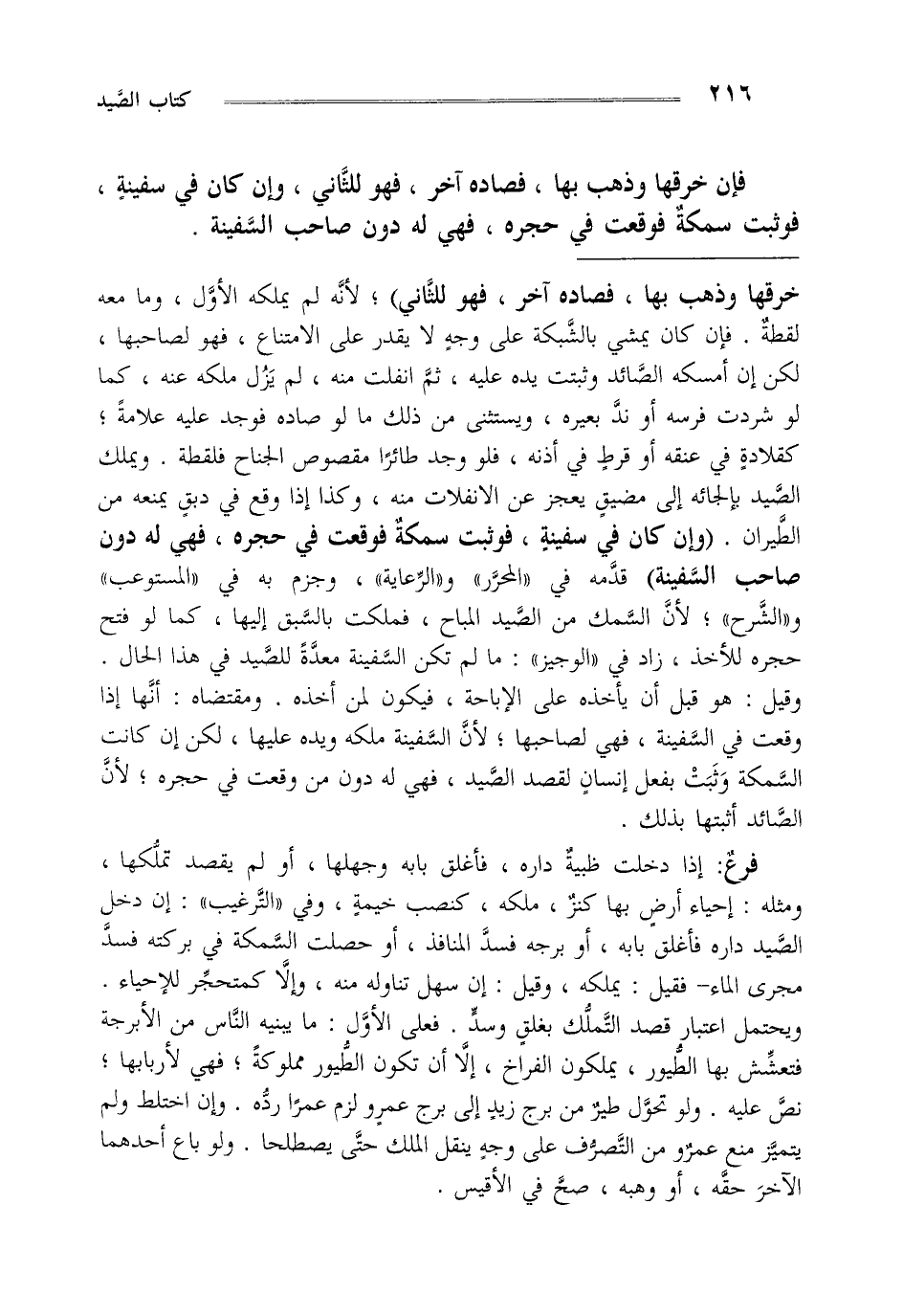 خرقها وذهب بها فصاده آخر فهو للثاني" لأنه لم يملكه الأول وما معه لقطة فإن كان يمشي بالشبكة على وجه لا يقدر على الامتناع فهو لصاحبها لكن إن أمسكه الصائد وثبتت يده عليه ثم انفلت منه لم يزل ملكه عنه كما لو شردت فرسه أو ند بعيره ويستثنى من ذلك ما لو صاده فوجد عليه علامة كقلادة في عنقه أو قرط في أذنه فلو وجد طائرا مقصوص الجناح فلقطة ويملك الصيد بإلجائه إلى مضيق يعجز عن الانفلات منه وكذا إذا وقع في دبق يمنعه من الطيران "وإن كان في سفينة فوثبت سمكة فوقعت في حجره فهي له دون صاحب السفينة" قدمه في المحرر والرعاية وجزم به في المستوعب والشرح لأن السمك من الصيد المباح فملكت بالسبق إليها كما لو فتح حجره للأخذ زاد في الوجيز ما لم تكن السفينة معدة للصيد في هذا الحال وقيل هو قبل أن يأخذه على الإباحة فيكون لمن أخذه ومقتضاه أنها إذا وقعت في السفينة فهي لصاحبها لأن السفينة ملكه ويده عليها لكن إن كانت السمكة وثبت بفعل إنسان لقصد الصيد فهي له دون من وقعت في حجره لأن الصائد أثبتها بذلك