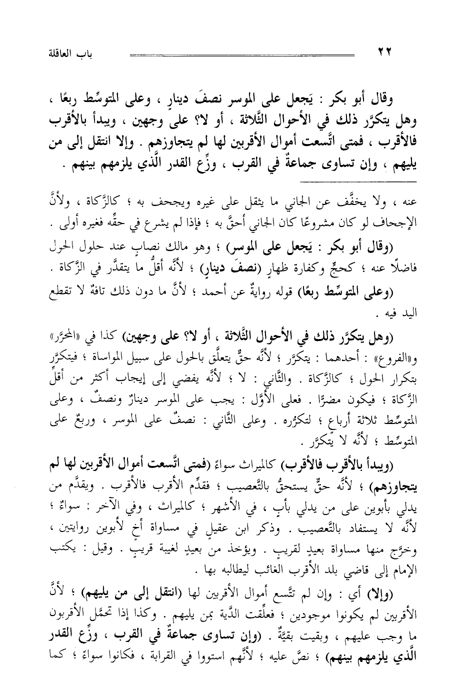 "وإلا" أي وإن لم تتسع أموال الأقربين لها "انتقل إلى من يليهم" لأن الأقربين لم يكونوا موجودين فعلقت الدية بمن يليهم وكذا إذا تحمل الأقربون ما وجب عليهم وبقيت بقية "وإن تساوى جماعة في القرب وزع القدر الذي يلزمهم بينهم" نص عليه لأنهم استووا في القرابة فكانوا سواء كما