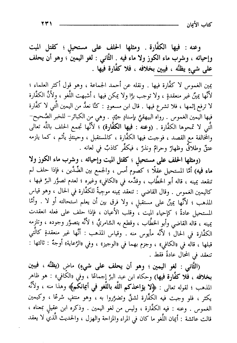 "الثاني: لغو اليمين وهو أن يحلف على شيء" ماض "يظنه فيبين بخلافه فلا كفارة فيها" وحكاه ابن عبد البر إجماعا وفي الكافي هو ظاهر المذهب لقوله تعالى {لَا يُؤَاخِذُكُمُ اللَّهُ بِاللَّغْوِ فِي أَيْمَانِكُمْ} وهذا منه ولأنه يكثر فلو وجبت فيه الكفارة لشق وتضرروا به وهو منتف شرعا وكيمين الغموس وعنه فيه الكفارة وليس من لغو اليمين وذكره ابن عقيل بمعناه قالت عائشة أيمان اللغو ما كان في المراء والمزاحة والهزل والحديث الذي لا يعقد