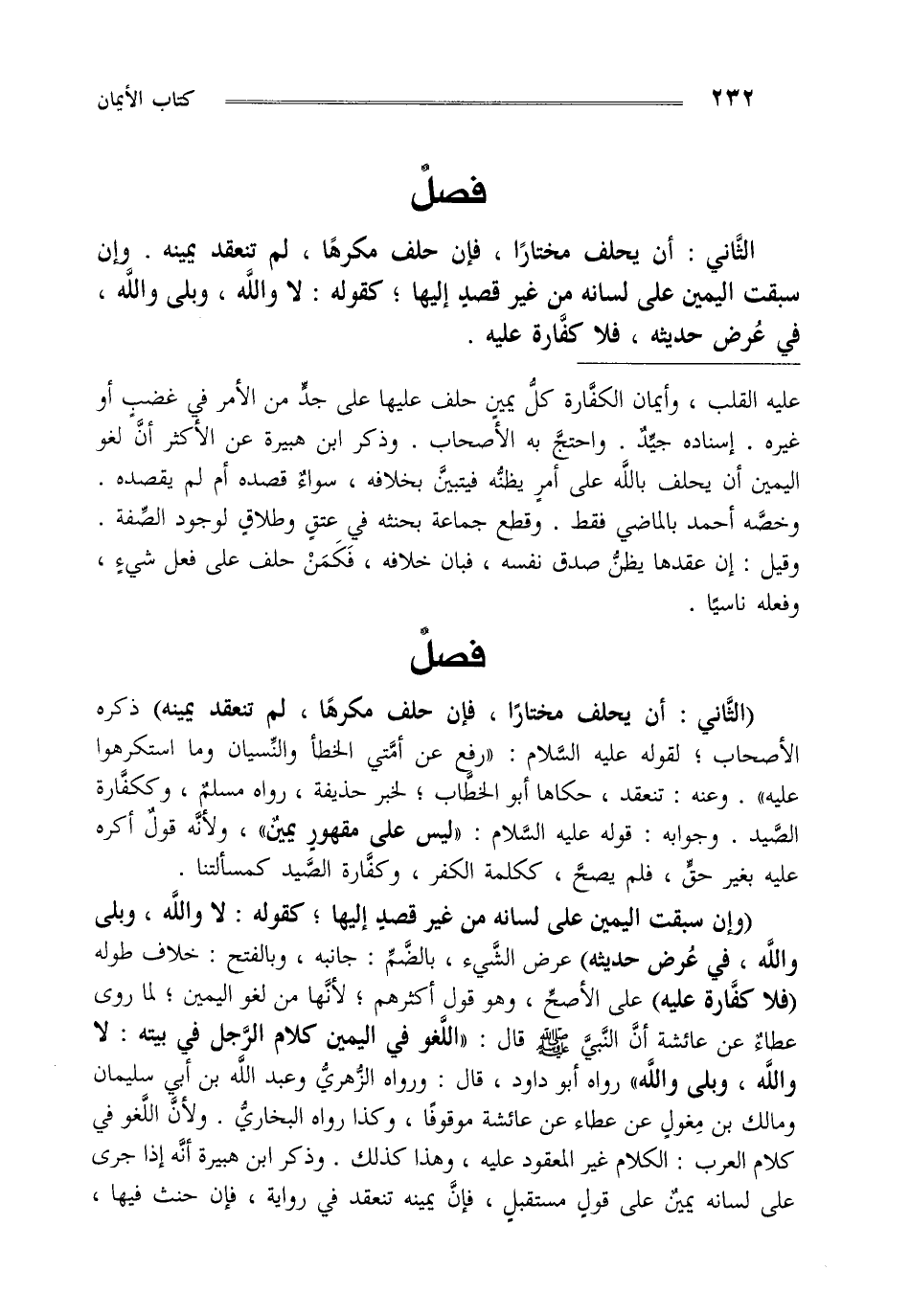 "وإن سبقت اليمين على لسانه من غير قصد إليها كقوله لا والله وبلى والله في عرض حديثه" عرض الشيء بالضم جانبه وبالفتح خلاف طوله "فلا كفارة عليه" على الأصح وهو قول أكثرهم لأنها من لغو اليمين لما روى عطاء عن عائشة أن النبي صلى الله عليه وسلم قال "اللغو في اليمين كلام الرجل في بيته لا والله وبلى والله" رواه أبو داود قال ورواه الزهري وعبد الله بن أبي سليمان ومالك بن مغول عن عطاء عن عائشة موقوفا وكذا رواه البخاري ولأن اللغو في كلام العرب الكلام غير المعقود عليه وهذا كذلك وذكر ابن هبيرة أنه إذا جرى على لسانه يمين على قول مستقبل فإن يمينه تنعقد في رواية فإن حنث فيها ,