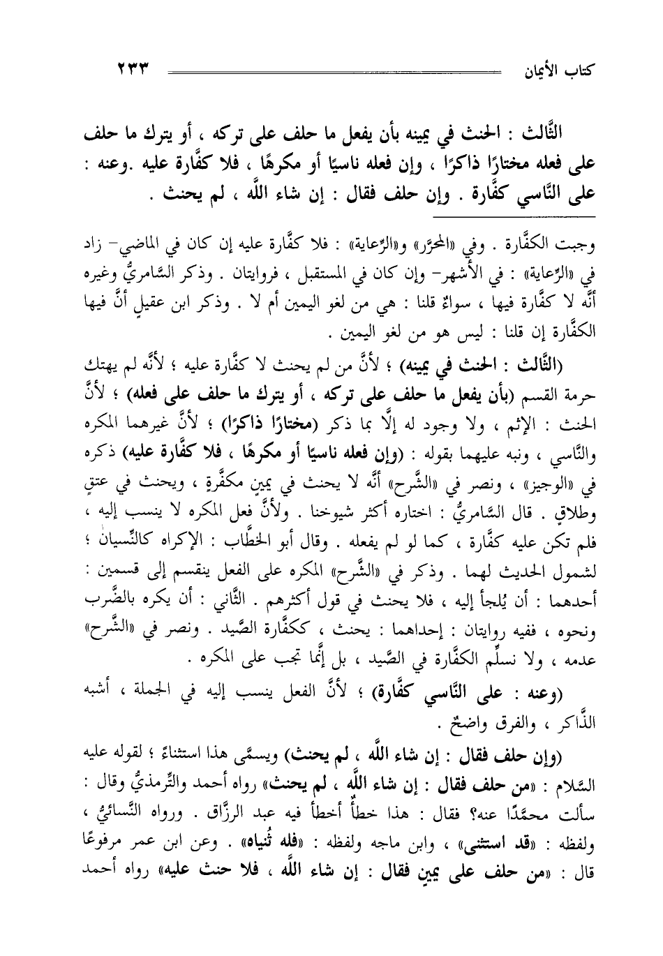 الثالث الحنث في يمينه بأن يفعل ما حلف على تركه أو يترك ما حلف على فعله مختارا ذاكرا وإن فعله ناسيا أو مكرها فلا كفارة عليه وعنه على الناسي كفارة وإن حلف فقال إن شاء الله لم يحنث