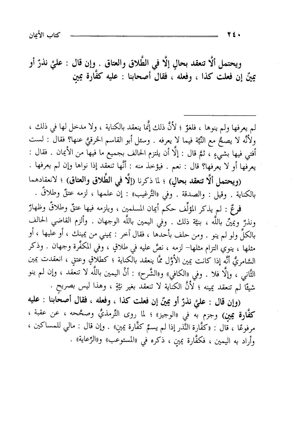 ويحتمل ألا تنعقد بحال إلا في الطلاق والعتاق وإن قال علي نذر أو يمين إن فعلت كذا وفعله فقال أصحابنا عليه كفارة يمين
