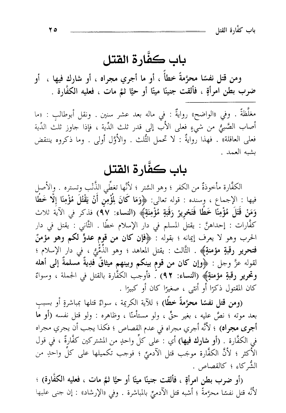 الكفارة مأخوذة من الكفر وهو الستر لأنها تغطي الذنب وتستره والأصل فيها الإجماع وسنده قوله تعالى {وَمَا كَانَ لِمُؤْمِنٍ أَنْ يَقْتُلَ مُؤْمِناً إِلَّا خَطَأً وَمَنْ قَتَلَ مُؤْمِناً خَطَأً فَتَحْرِيرُ رَقَبَةٍ مُؤْمِنَةٍ} [النساء: 97] فذكر في الآية ثلاث كفارات إحداهن يقتل المسلم في دار الإسلام خطأ. الثاني يقتل في دار الحرب وهو لا يعرف إيمانه بقوله {فَإِنْ كَانَ مِنْ قَوْمٍ عَدُوٍّ لَكُمْ وَهُوَ مُؤْمِنٌ فَتَحْرِيرُ رَقَبَةٍ مُؤْمِنَةٍ} الثالث يقتل المعاهد وهو الذمي في دار الإسلام لقوله عز وجل {وَإِنْ كَانَ مِنْ قَوْمٍ بَيْنَكُمْ وَبَيْنَهُمْ مِيثَاقٌ فَدِيَةٌ مُسَلَّمَةٌ إِلَى أَهْلِهِ وَتَحْرِيرُ رَقَبَةٍ مُؤْمِنَةٍ} [النساء: 92] فأوجب الكفارة بالقتل في الجملة وسواء كان المقتول ذكرا أو أنثى صغيرا كان أو كبيرا.