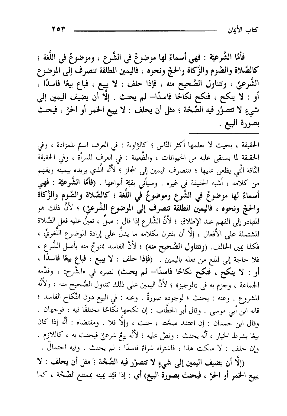 فأما الشرعية: فهي أسماء لها موضوع في الشرع وموضوع في اللغة كالصلاة والصوم والزكاة والحج ونحوه فاليمين المطلقة تنصرف إلى الموضوع الشرعي وتتناول الصحيح منه فإذا حلف لا يبيع فباع بيعا فاسدا أو لا ينكح فنكح نكاحا فاسدا لم يحنث إلا أن يضيف اليمين إلى شيء لا تتصور فيه الصحة مثل أن يحلف لا يبيع الخمر أو الحر فيحنث بصورة البيع