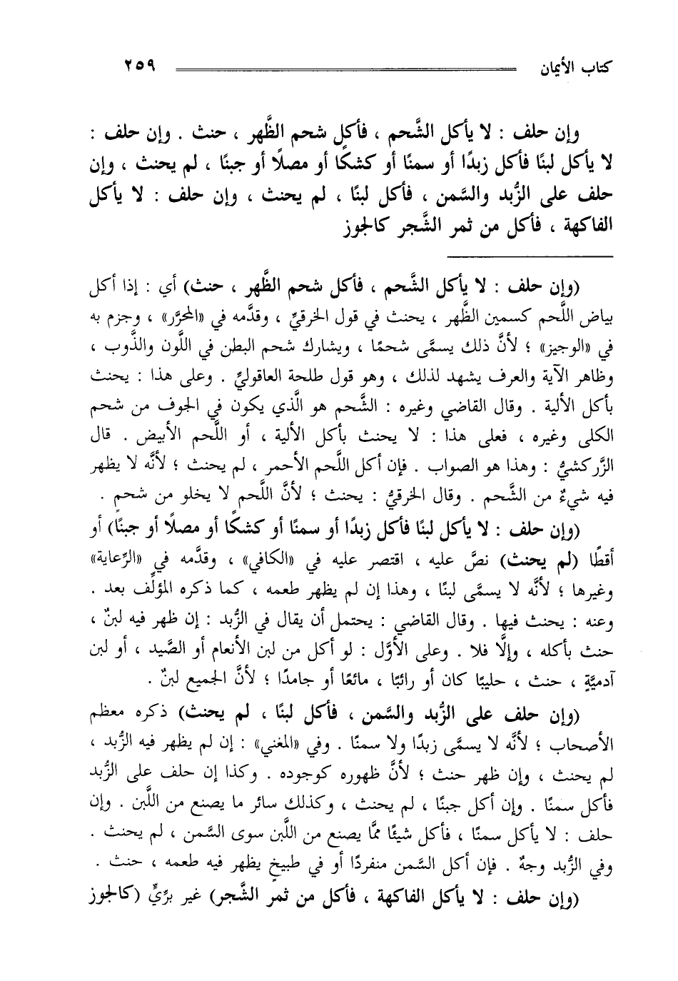 "وإن حلف لا يأكل الشحم فأكل شحم الظهر حنث" أي إذا أكل بياض اللحم كسمين الظهر يحنث في قول الخرقي وقدمه في المحرر وجزم به في الوجيز لأن ذلك يسمى شحما ويشارك شحم البطن في اللون والذوب وظاهر الآية والعرف يشهد لذلك وهو قول طلحة العاقولي وعلى هذا يحنث بأكل الإلية وقال القاضي وغيره الشحم هو الذي يكون في الجوف من شحم الكلى وغيره فعلى هذا لا يحنث بأكل الإلية أو اللحم الأبيض قال الزركشي وهذا هو الصواب فإن أكل اللحم الأحمر لم يحنث لأنه لا يظهر فيه شيء من الشحم وقال الخرقي يحنث لأن اللحم لا يخلو من شحم.