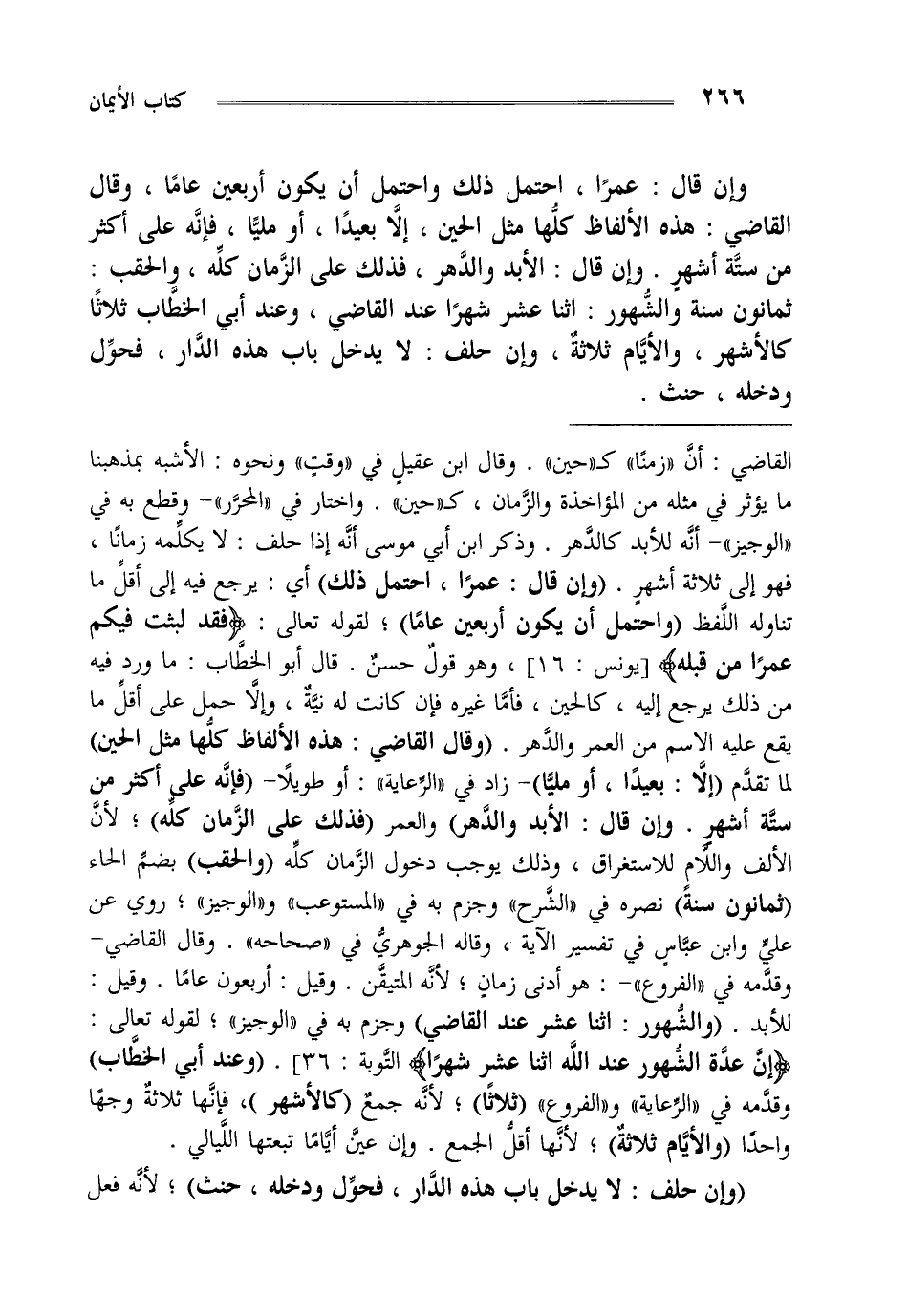 القاضي: إن زمنا كحين وقال ابن عقيل في وقت ونحوه الأشبه بمذهبنا ما يؤثر في مثله من المؤاخذة والزمان كحين واختار في المحرر وقطع له في الوجيز أنه للأبد كالدهر وذكر ابن أبي موسى أنه إذا حلف لا يكلمه زمانا فهو إلى ثلاثة أشهر "وإن قال عمرا احتمل ذلك" أي يرجع فيه إلى أقل ما تناوله اللفظ واحتمل أن يكون أربعين عاما لقوله تعالى {فَقَدْ لَبِثْتُ فِيكُمْ عُمُراً مِنْ قَبْلِهِ} [يونس: 16] وهو قول حسن قال أبو الخطاب ما ورد فيه من ذلك يرجع إليه كالحين فأما غيره فإن كانت له نية وإلا حمل على أقل ما يقع عليه الاسم من العمر والدهر "وقال القاضي هذه الألفاظ كلها مثل الحين" لما تقدم "إلا بعيدا أو مليا" زاد في الرعاية أو طويلا "فإنه على أكثر من ست أشهر وإن قال الأبد والدهر" والعمر "فذلك على الزمان كله" لأن الألف واللام للاستغراق وذلك يوجب دخول الزمان كله "والحقب" بضم الحاء "ثمانون سنة" نصره في الشرح وجزم به في المستوعب والوجيز روي عن علي وابن عباس في تفسير الآية وقاله الجوهري في صحاحه وقال القاضي وقدمه في الفروع هو أدنى زمان لأنه المتيقن وقيل أربعون عاما وقيل للأبد "والشهور اثنا عشر عند القاضي" وجزم به في الوجيز لقوله تعالى {إِنَّ عِدَّةَ الشُّهُورِ عِنْدَ اللَّهِ اثْنَا عَشَرَ شَهْراً} [التوبة: 36] "وعند أبي الخطاب" وقدمه في الرعاية والفروع "ثلاثا" لأنه جمع "كالأشهر" فإنها ثلاثة وجها واحدا "والأيام ثلاثة" لأنها أقل الجمع وإن عين أياما تبعتها الليالي.