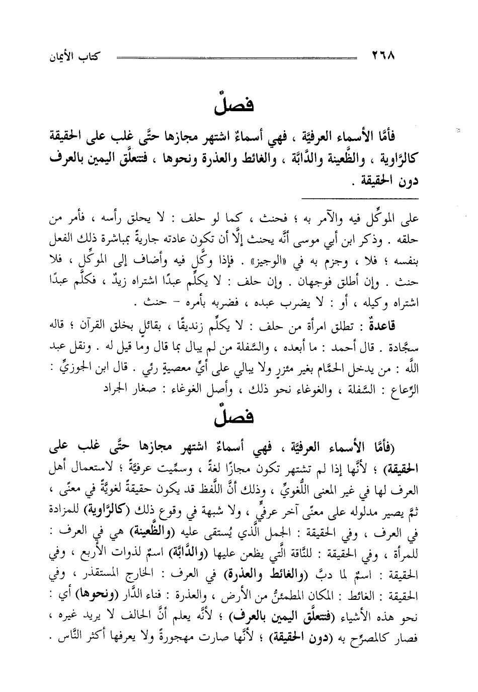 "فأما الأسماء العرفية فهي أسماء اشتهر مجازها حتى غلب على الحقيقة" لأنها إذا لم تشتهر تكون مجازا لغة وسميت عرفية لاستعمال أهل العرف لها في غير المعنى اللغوي وذلك أن اللفظ قد يكون حقيقة لغوية في معنى ثم يصير مدلوله على معنى آخر عرفي ولا شبهة في وقوع ذلك "كالراوية" للمزادة في العرف وفي الحقيقة الجمل الذي يستقى عليه "والظعينة" هي في العرف للمرأة وفي الحقيقة للناقة التي يظعن عليها "والدابة" اسم لذوات الأربع وفي الحقيقة اسم لما دب "والغائط والعذرة" في العرف الخارج المستقذر وفي الحقيقة الغائط المكان المطمئن من الأرض والعذرة فناء الدار "ونحوها" أي نحو هذه الأشياء "فتتعلق اليمين بالعرف" لأنه يعلم أن الحالف لا يريد غيره فصار كالمصرح به "دون الحقيقة" لأنها صارت مهجورة ولا يعرفها أكثر الناس .