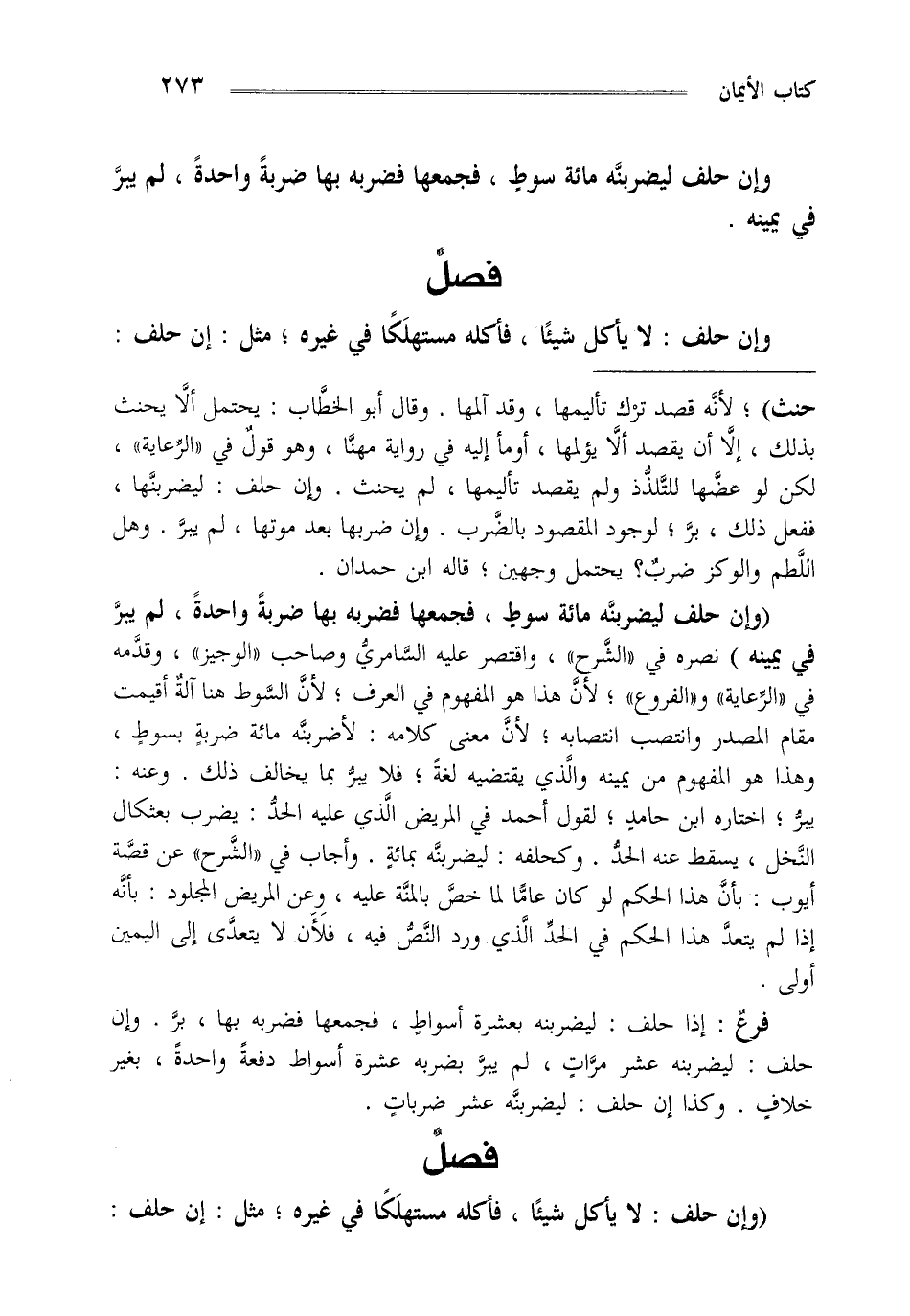 "وإن حلف ليضرنه مائة سوط فجمعها فضربه بها ضربة واحدة لم يبر في يمينه" نصره في الشرح واقتصر عليه السامري وصاحب الوجيز وقدمه في الرعاية والفروع لأن هذا هو المفهوم في العرف لأن السوط هنا آلة أقيمت مقام المصدر وانتصب انتصابه لأن معنى كلامه لأضربنه مائة ضربة بسوط وهذا هو المفهوم من يمينه والذي يقتضيه لغة فلا يبر بما يخالف ذلك وعنه يبر اختاره ابن حامد لقول أحمد في المريض الذي عليه الحد يضرب بعثكال النخل يسقط عنه الحد وكحلفه ليضربنه بمائة وأجاب في الشرح عن قصة أيوب بأن هذا الحكم لو كان عاما لما خص بالمنة عليه وعن المريض المجلود بأنه إذا لم يتعد هذا الحكم في الحد الذي ورد النص فيه فلأن لا يتعدى إلى اليمين أولى