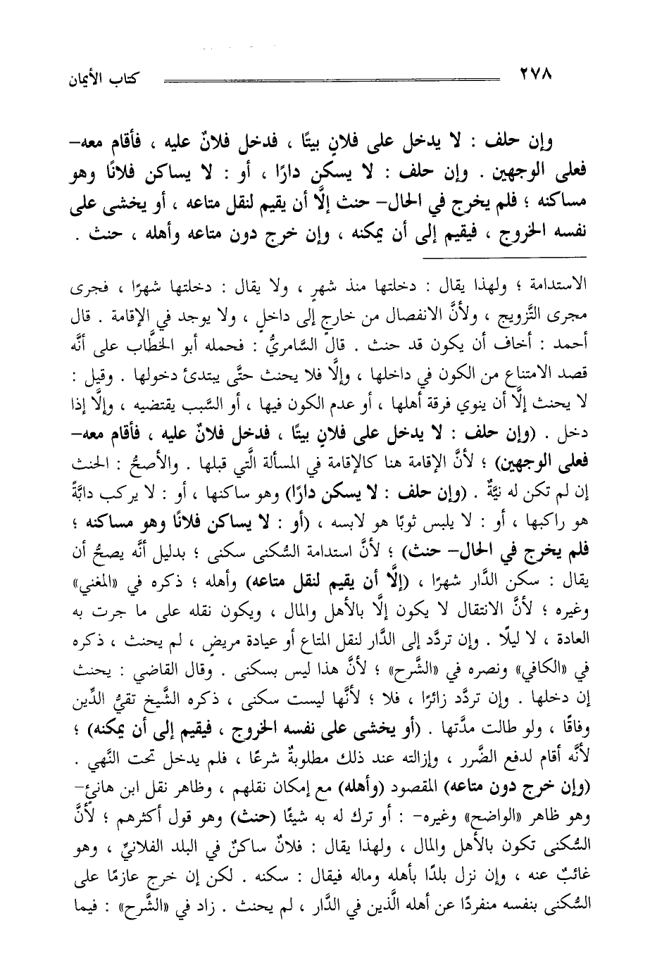 الاستدامة ولهذا يقال دخلتها منذ شهر ولا يقال دخلتها شهرا فجرى مجرى التزويج ولأن الانفصال من خارج إلى داخل ولا يوجد في الإقامة قال أحمد أخاف أن يكون قد حنث قال السامري فحمله أبو الخطاب على أنه قصد الامتناع من الكون في داخلها وإلا فلا يحنث حتى يبتدئ دخولها وقيل لا يحنث إلا أن ينوي فرقة أهلها أو عدم الكون فيها أو السبب يقتضيه وإلا إذا دخل "وإن حلف لا يدخل على فلان بيتا فدخل فلان عليه فأقام معه فعلى الوجهين" لأن الإقامة هنا كالإقامة في المسألة التي قبلها والأصح الحنث إن لم تكن له نية "وإن حلف لا يسكن دارا" وهو ساكنها أو لا يركب دابة هو راكبها أو لا يلبس ثوبا هو لابسه "أو لا يساكن فلانا وهو مساكنه فلم يخرج في الحال حنث" لأن استدامة السكنى سكنى بدليل أنه يصح أن يقال سكن الدار شهرا "إلا أن يقيم لنقل متاعه" وأهله ذكره في المغني وغيره لأن الانتقال لا يكون إلا بالأهل والمال ويكون نقله على ما جرت به العادة لا ليلا وإن تردد إلى الدار لنقل المتاع أو عيادة مريض لم يحنث ذكره في الكافي ونصره في الشرح لأن هذا ليس بسكنى وقال القاضي يحنث إن دخلها وإن تردد زائرا فلا لأنها ليست سكنى ذكره الشيخ تقي الدين وفاقا ولو طالت مدتها "أو يخشى على نفسه الخروج فيقيم إلى أن يمكنه" لأنه أقام لدفع الضرر وإزالته عند ذلك مطلوبة شرعا فلم يدخل تحت النهي "وإن خرج دون متاعه" المقصود "وأهله" مع إمكان نقلهم وظاهر نقل ابن هانئ وهو ظاهر الواضح وغيره أو ترك له به شيئا "حنث" وهو قول أكثرهم لأن السكنى تكون بالأهل والمال ولهذا يقال فلان ساكن في البلد الفلاني وهو غائب عنه وإن نزل بلدا بأهله وماله فيقال سكنه لكن إن خرج عازما على السكنى بنفسه منفردا عن أهله الذين في الدار لم يحنث زاد في الشرح فيما