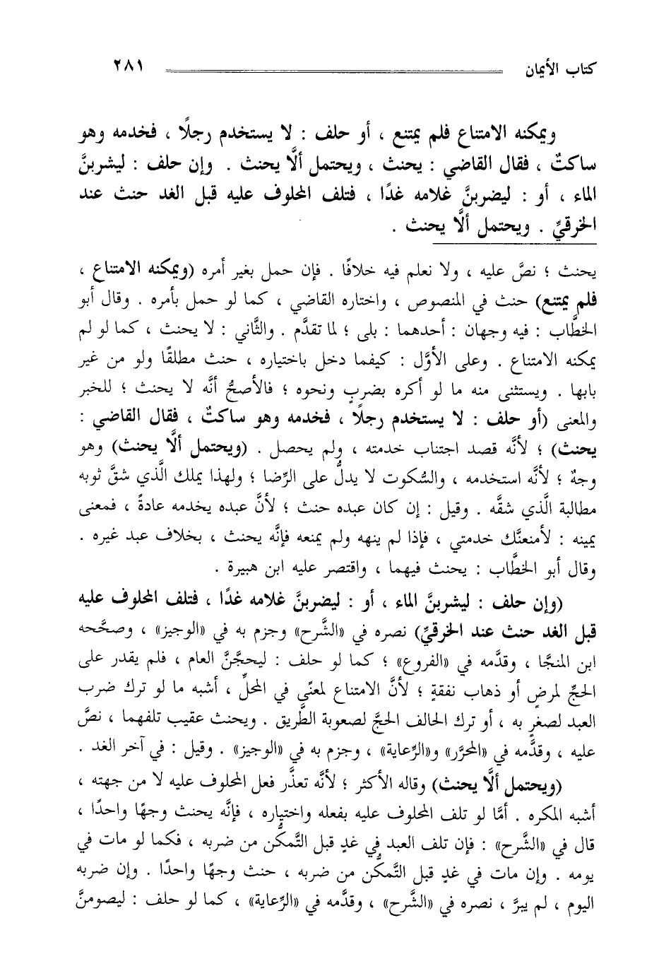 "وإن حلف ليشربن الماء أو ليضربن غلامه غدا فتلف المحلوف عليه قبل الغد حنث عند الخرقي" نصره في الشرح وجزم به في الوجيز وصححه ابن المنجا وقدمه في الفروع كما لو حلف ليحجن العام فلم يقدر على الحج لمرض أو ذهاب نفقة لأن الامتناع لمعنى في المحل أشبه ما لو ترك ضرب العبد لصغر به أو ترك الحالف الحج لصعوبة الطريق ويحنث عقيب تلفهما نص عليه وقدمه في المحرر والرعاية وجزم به في الوجيز وقيل في آخر الغد.