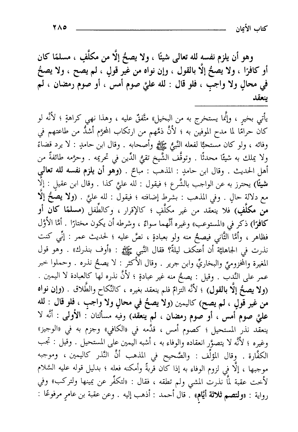 يأتي بخير وإنما يستخرج به من البخيل" متفق عليه وهذا نهي كراهة لأنه لو كان حراما لما مدح الموفيين به لأن ذمهم من ارتكاب المحرم أشد من طاعتهم في وفائه ولو كان مستحبا لفعله النبي صلى الله عليه وسلم وأصحابه وقال ابن حامد لا يرد قضاء ولا يملك به شيئا محدثا وتوقف الشيخ تقي الدين في تحريمه وحرمه طائفة من أهل الحديث وقال ابن حامد المذهب مباح "وهو أن يلزم نفسه لله تعالى شيئا" يحترز به عن الواجب بالشرع فيقول لله علي كذا وقال ابن عقيل إلا مع دلالة حال وفي المذهب بشرط إضافته فيقول لله علي "ولا يصح إلا من مكلف" فلا ينعقد من غير مكلف كالإقرار وكالطفل "مسلما كان أو كافرا" ذكر في المستوعب وغيره أنهما سواء وشرطه أن يكون مختارا أما الأول فظاهر وأما الثاني فيصح منه ولو بعبادة نص عليه لحديث عمر إني كنت نذرت في الجاهلية أن أعتكف ليلة فقال النبي صلى الله عليه وسلم "أوف بنذرك" وهو قول المغيرة والمخزومي والبخاري وابن جرير وقال الأكثر لا يصح نذره وحملوا خبر عمر على الندب وقيل يصح منه غير عبادة لأن نذره لها كالعبادة لا اليمين "ولا يصح إلا بالقول" لأنه التزام فلم ينعقد بغيره كالنكاح والطلاق "وإن نواه من غير قول لم يصح" كاليمين "ولا يصح في محال ولا واجب فلو قال لله علي صوم أمس أو صوم رمضان لم ينعقد" وفيه مسألتان الأولى: أنه لا ينعقد نذر المستحيل كصوم أمس قدمه في الكافي وجزم به في الوجيز وغيره لأنه لا يتصور انعقاده والوفاء به أشبه اليمين على المستحيل وقيل تجب الكفارة قال المؤلف والصحيح في المذهب أن النذر كاليمين وموجبه موجبها إلا في لزوم الوفاء به إذا كان قربة وأمكنه فعله بدليل قوله عليه السلام لأخت عقبة لما نذرت المشي ولم تطقه فقال "لتكفر عن يمينها ولتركب" وفي رواية "ولتصم ثلاثة أيام" قال أحمد أذهب إليه وعن عقبة بن عامر مرفوعا :