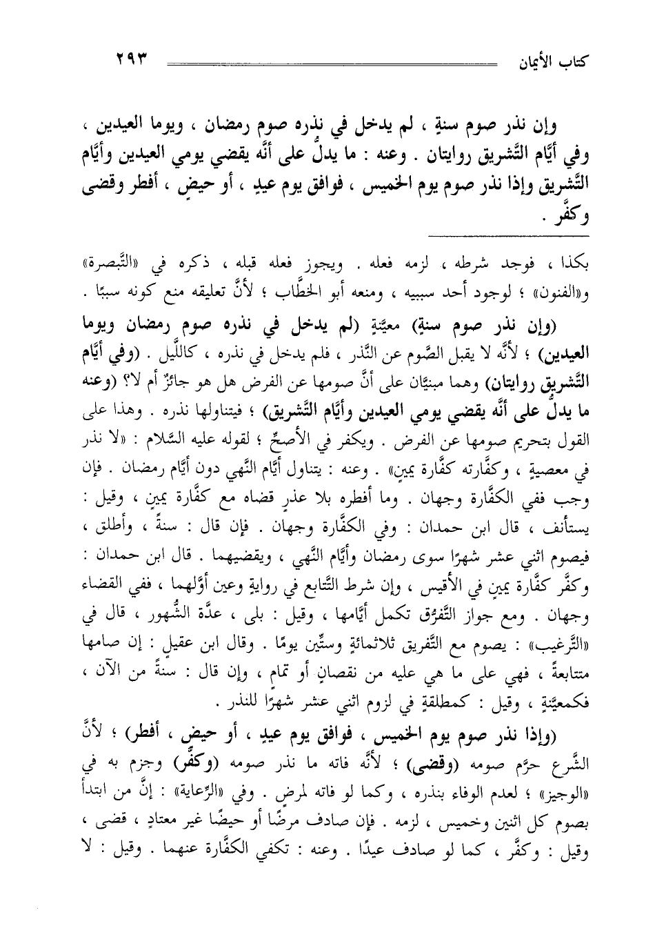 "وإن نذر صوم سنة" معينة "لم يدخل في نذره صوم رمضان ويوما العيدين" لأنه لا يقبل الصوم عن النذر فلم يدخل في نذره كالليل "وفي أيام التشريق روايتان" وهما مبنيان على أن صومها عن الفرض هل هو جائز أم لا "وعنه ما يدل على أنه يقضي يومي العيدين وأيام التشريق" فيتناولها نذره وهذا على القول بتحريم صومها عن الفرض ويكفر في الأصح لقوله عليه السلام "لا نذر في معصية وكفارته كفارة يمين" وعنه يتناول أيام النهي دون أيام رمضان فإن وجب ففي الكفارة وجهان وما أفطره بلا عذر قضاه مع كفارة يمين وقيل يستأنف قال ابن حمدان وفي الكفارة وجهان فإن قال سنة وأطلق فيصوم اثني عشر شهرا سوى رمضان وأيام النهي ويقضيهما قال ابن حمدان وكفر كفارة يمين في الأقيس وإن شرط التتابع في رواية وعين أولهما ففي القضاء وجهان ومع جواز التفرق تكمل أيامها وقيل بلى عدة الشهور قال في الترغيب يصوم مع التفريق ثلاثمائة وستين يوما وقال ابن عقيل إن صامها متتابعة فهي على ما هي عليه من نقصان أو تمام وإن قال سنة من الآن فكمعينة وقيل كمطلقة في لزوم اثني عشر شهرا للنذر.