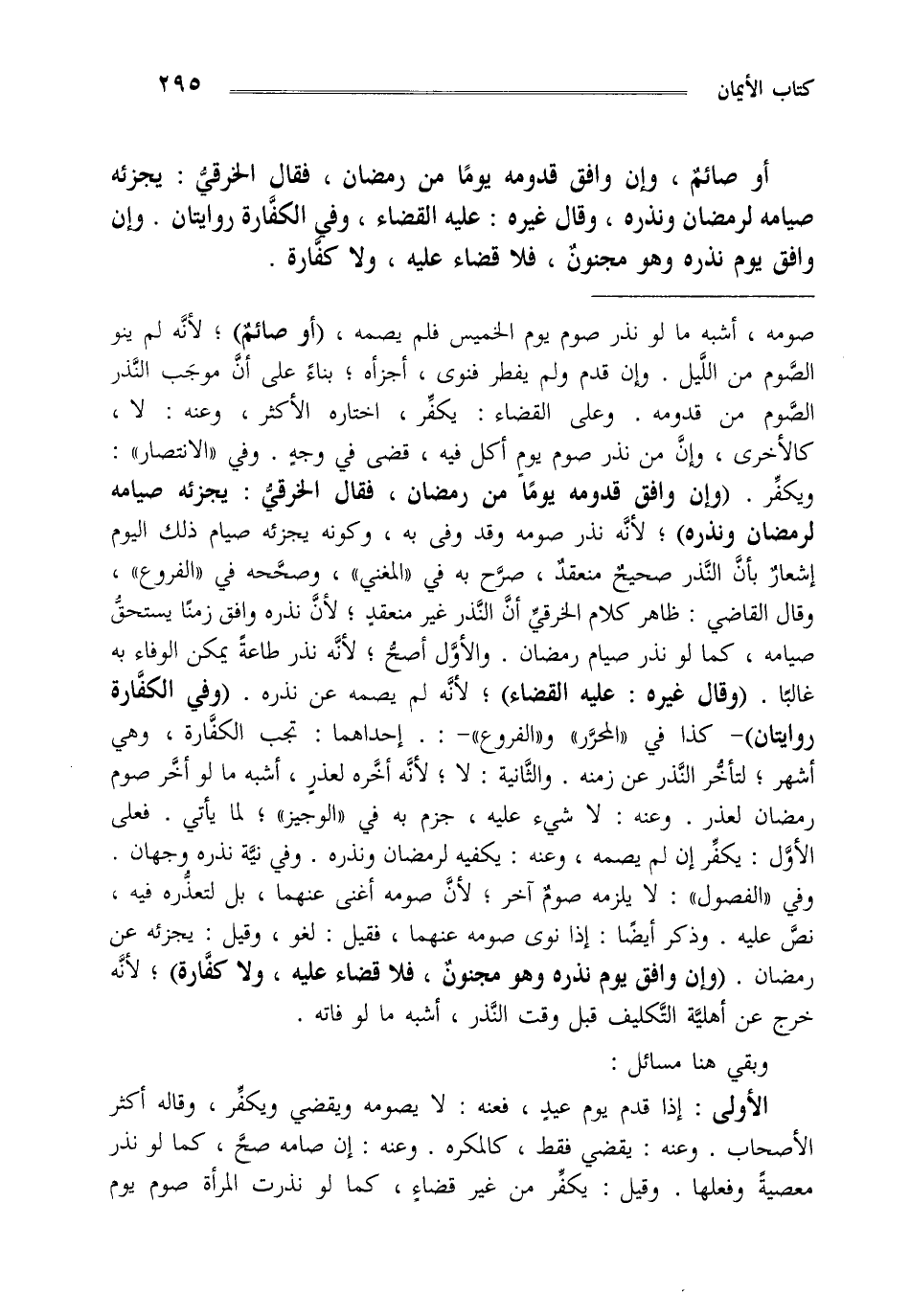 صومه أشبه ما لو نذر صوم يوم الخميس فلم يصمه "أو صائم" لأنه لم ينو الصوم من الليل وإن قدم ولم يفطر فنوى أجزأه بناء على أن موجب النذر الصوم من قدومه وعلى القضاء يكفر اختاره الأكثر وعنه لا كالأخرى وإن من نذر صوم يوم أكل فيه قضى في وجه وفي الانتصار ويكفر "وإن وافق قدومه يوما من رمضان فقال الخرقي يجزئه صيامه لرمضان ونذره" لأنه نذر صومه وقد وفى به وكونه يجزئه صيام ذلك اليوم إشعار بأن النذر صحيح منعقد صرح به في المغني وصححه في الفروع وقال القاضي ظاهر كلام الخرقي أن النذر غير منعقد لأن نذره وافق زمنا يستحق صيامه كما لو نذر صيام رمضان والأول أصح لأنه نذر طاعة يمكن الوفاء به غالبا "وقال غيره عليه القضاء" لأنه لم يصمه عن نذره "وفي الكفارة روايتان" كذا في المحرر والفروع إحداهما تجب الكفارة وهي أشهر لتأخر النذر عن زمنه والثانية: لا لأنه أخره لعذر أشبه ما لو أخر صوم رمضان لعذر وعنه لا شيء عليه جزم به في الوجيز لما يأتي فعلى الأول يكفر إن لم يصمه وعنه يكفيه لرمضان ونذره وفي نية نذره وجهان وفي الفصول لا يلزمه صوم آخر لأن صومه أغنى عنهما بل لتعذره فيه نص عليه وذكر أيضا إذا نوى صومه عنهما فقيل لغو وقيل يجزئه عن رمضان "وإن وافق يوم نذره وهو مجنون فلا قضاء عليه ولا كفارة" لأنه خرج عن أهلية التكليف قبل وقت النذر أشبه ما لو فاته