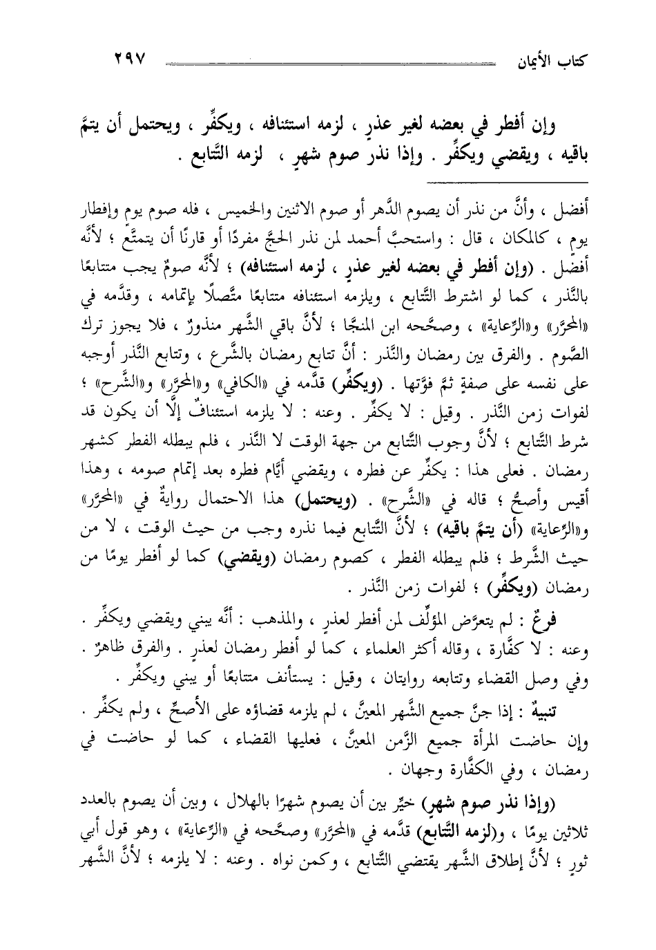 أفضل وأن من نذر أن يصوم الدهر أو صوم الاثنين والخميس فله صوم يوم وإفطار يوم كالمكان قال واستحب أحمد لمن نذر الحج مفردا أو قارنا أن يتمتع لأنه أفضل "وإن أفطر في بعضه لغير عذر لزمه استئنافه" لأن صوم يجب متتابعا بالنذر كما لو اشترط التتابع ويلزمه استئنافه متتابعا متصلا بإتمامه وقدمه في المحرر والرعاية وصححه ابن المنجا لأن باقي الشهر منذور فلا يجوز ترك الصوم والفرق بين رمضان والنذر أن تتابع رمضان بالشرع وتتابع النذر أوجبه على نفسه على صفة ثم فوتها "ويكفر" قدمه في الكافي والمحرر والشرح لفوات زمن النذر وقيل لا يكفر وعنه لا يلزمه استئناف إلا أن يكون قد شرط التتابع لأن وجوب التتابع من جهة الوقت لا النذر فلم يبطله الفطر كشهر رمضان فعلى هذا يكفر عن فطره ويقضي أيام فطره بعد إتمام صومه وهذا أقيس وأصح قاله في الشرح "ويحتمل" هذا الاحتمال رواية في المحرر والرعاية "أن يتم باقيه" لأن التتابع فيما نذره وجب من حيث الوقت لا من حيث الشرط فلم يبطله الفطر كصوم رمضان "ويقضي" كما لو أفطر يوما من رمضان "ويكفر" لفوات زمن النذر