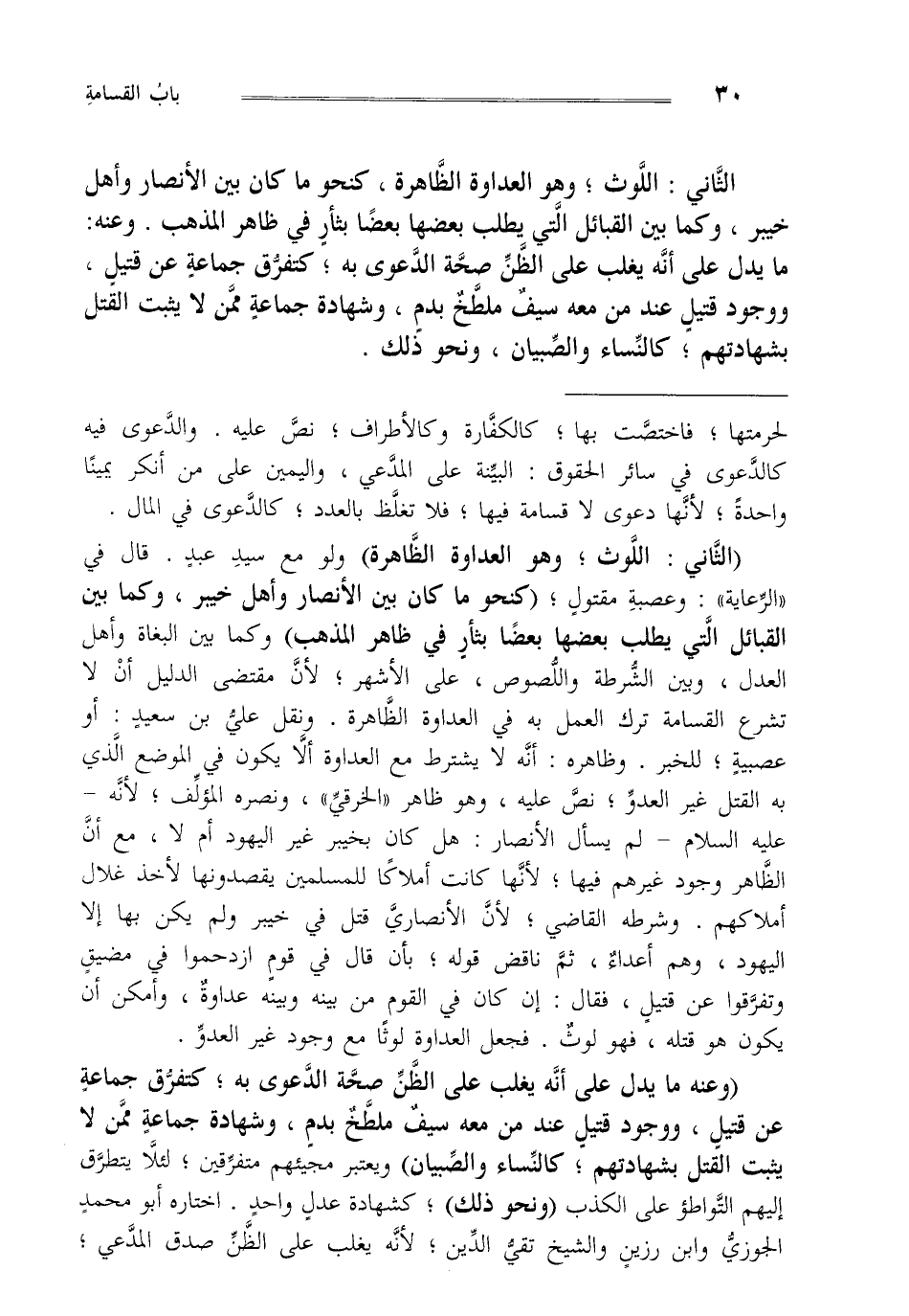 "الثاني اللوث وهو العداوة الظاهرة" ولو مع سيد عبد قال في الرعاية وعصبة مقتول "كنحو ما كان بين الأنصار وأهل خيبر وكما بين القبائل التي يطلب بعضها بعضا بثأر في ظاهر المذهب وكما بين البغاة وأهل العدل وبين الشرطة واللصوص على الأشهر لأن مقتضى الدليل أن لا تشرع القسامة ترك العمل به في العداوة الظاهرة ونقل علي بن سعيد أو عصبية للخبر وظاهره أنه لا يشترط مع العداوة ألا يكون في الموضع الذي به القتل غير العدو نص عليه وهو ظاهر الخرقي ونصره المؤلف لأنه عليه السلام لم يسأل الأنصار هل كان بخيبر غير اليهود أم لا مع أن الظاهر وجود غيرهم فيها لأنها كانت أملاكا للمسلمين يقصدونها لأخذ غلال أملاكهم وشرطه القاضي لأن الأنصاري قتل في خيبر ولم يكن بها إلا اليهود وهم أعداء ثم ناقض قوله بأن قال في قوم ازدحموا في مضيق وتفرقوا عن قتيل فقال إن كان في القوم من بينه وبينه عداوة وأمكن أن يكون هو قتله فهو لوث فجعل العداوة لوثا مع وجود غير العدو.