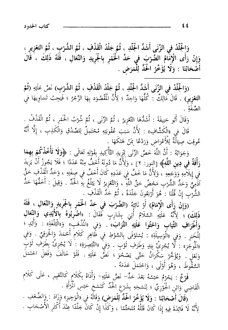 والجلد في الزنا أشد الجلد ثم جلد القذف ثم الشرب ثم التعزير وإن رأى الإمام الضرب في حد الخمر بالجريد والنعال فله ذلك، قال أصحابنا ولا يؤخر الحد للمرض.