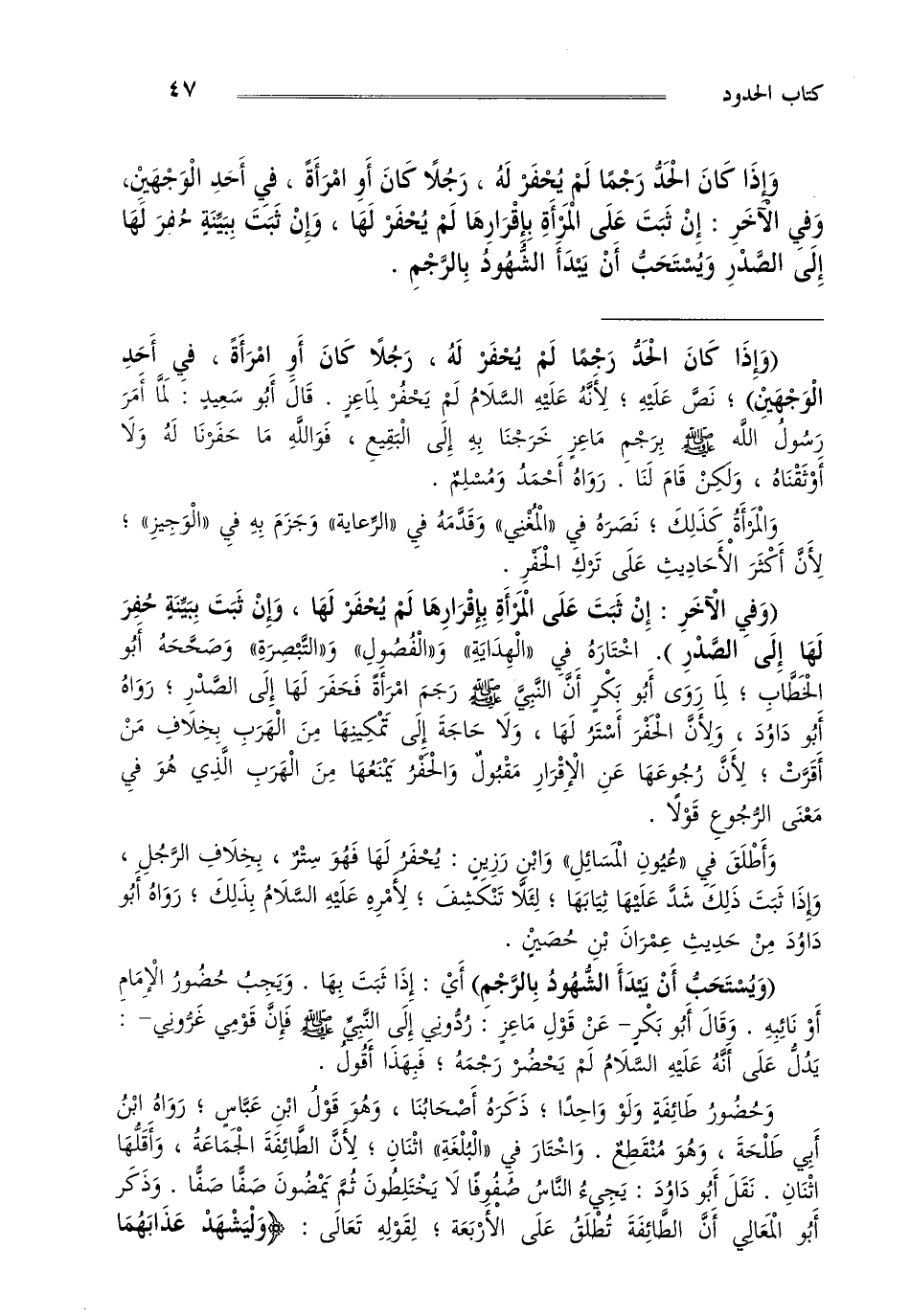 "وفي الآخر إن ثبت على المرأة بإقرارها لم يحفر لها وإن ثبت ببينة حفر لها إلى الصدر" اختاره في الهداية والفصول والتبصرة وصححه أبو الخطاب لما روى أبو بكر "أن النبي صلى الله عليه وسلم رجم امرأة فحفر لها إلى الصدر" رواه أبو داود ولأن الحفر أستر لها ولا حاجة إلى تمكينها من الهرب بخلاف من أقرت لأن رجوعها عن الإقرار مقبول والحفر يمنعها من الهرب الذي هو في معنى الرجوع قولا.