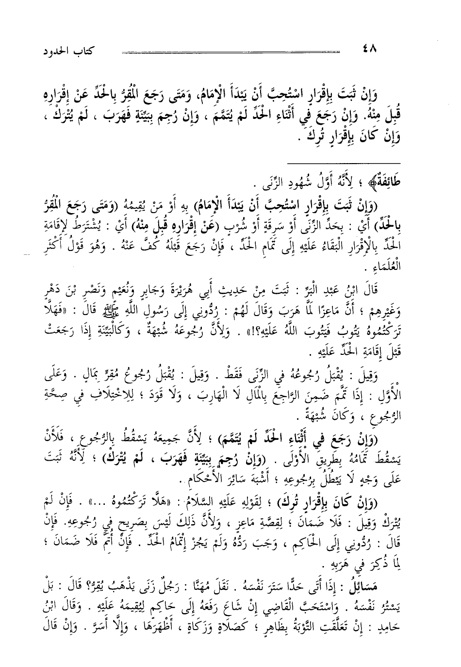 وإن ثبت بإقرار استحب أن يبدأ الإمام ومتى رجع المقر بالحد عن إقراره قبل منه وإن رجع في أثناء الحد لم يتمم,وإن رجم ببينة فهرب,لم يترك وإن كان بإقرار ترك.