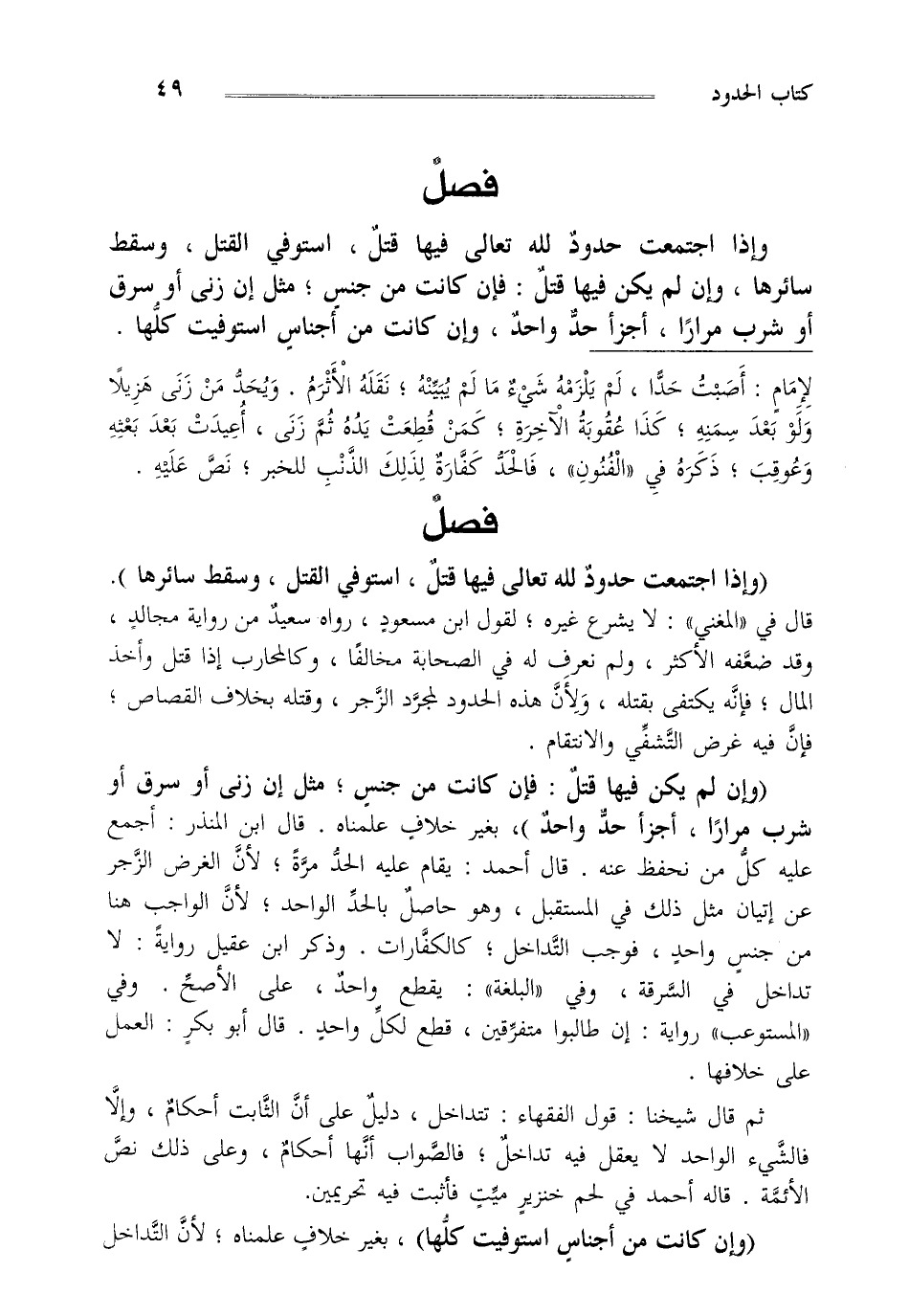 وإذا اجتمعت حدود لله تعالى فيها قتل,استوفي القتل وسقط سائرها,وإن لم يكن فيها قتل فإن كانت من جنس مثل إن زنى أو سرق أو شرب مرارا أجزأ حد واحد وإن كانت من أجناس استوفيت كلها.