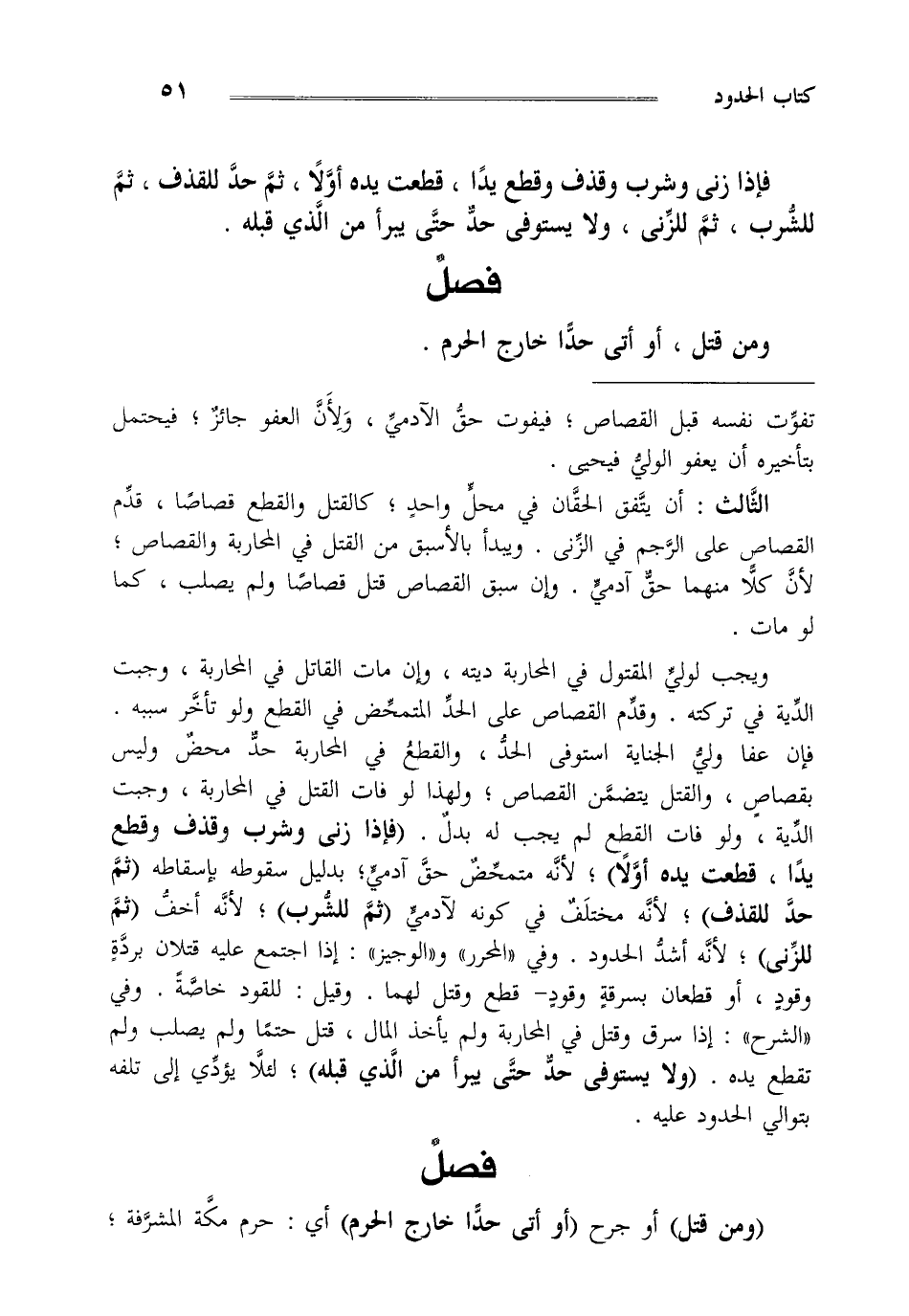 الثالث: أن يتفق الحقان في محل واحد كالقتل والقطع قصاصا قدم القصاص على الرجم في الزنى ويبدأ بالأسبق من القتل في المحاربة والقصاص لأن كلا منهما حق آدمي وإن سبق القصاص قتل قصاصا ولم يصلب كما لو مات.