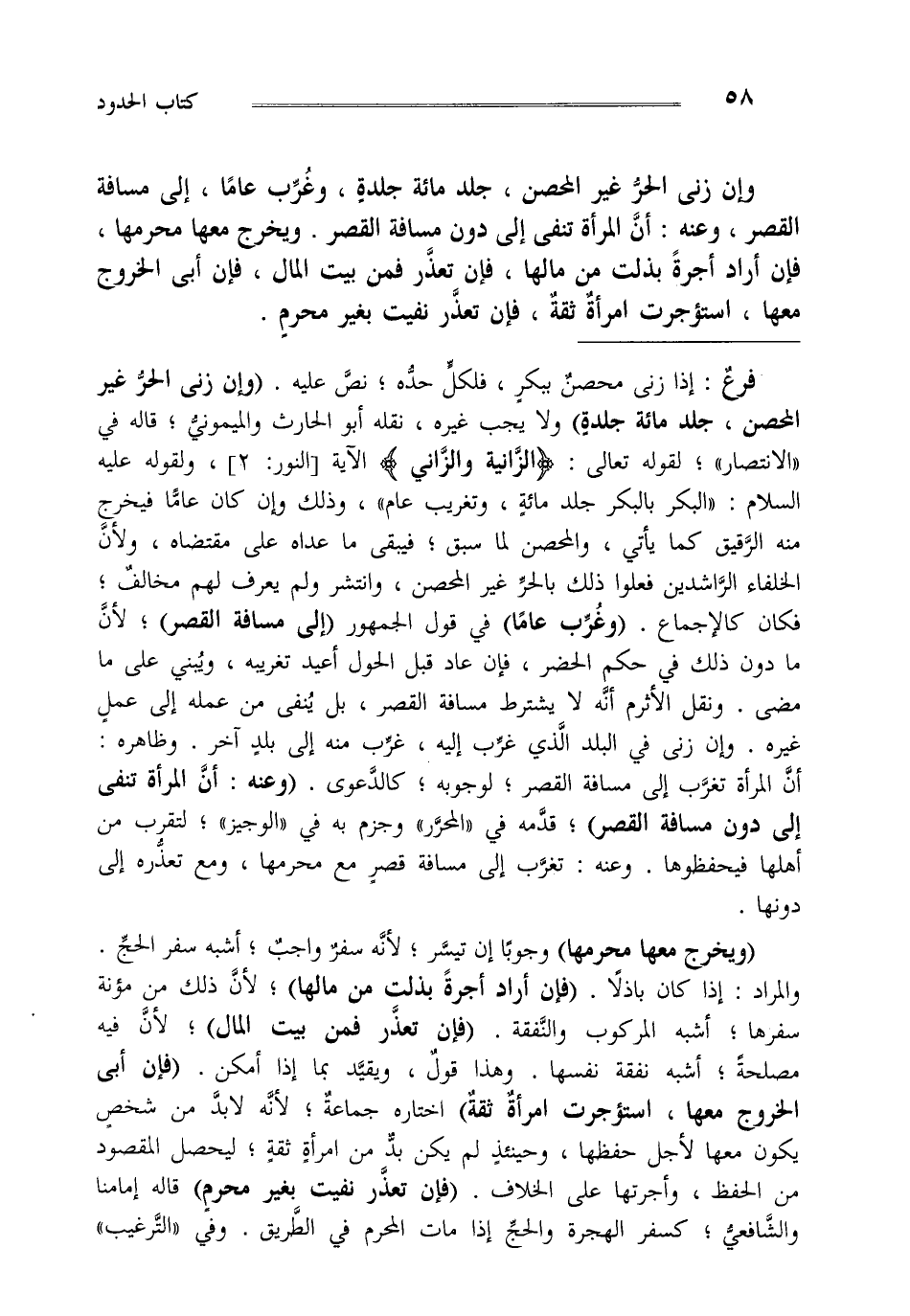 وإن زنى الحر غير المحصن جلد مائة جلدة وغرب عاما إلى مسافة القصر وعنه أن المرأة تنفى إلى دون مسافة القصر ويخرج معها محرمها فإن راد أجرة بذلت من مالها فإن تعذر فمن بيت المال فإن أبى الخروج معها استؤجرت امرأة ثقة فإن تعذر نفيت بغير محرم.