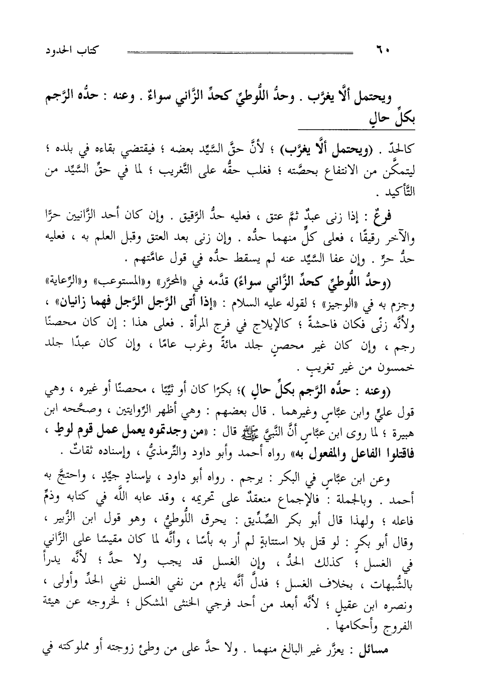 ويحتمل ألا يغرب وحد اللوطي كحد الزاني سواء وعنه حده الرجم بكل حال