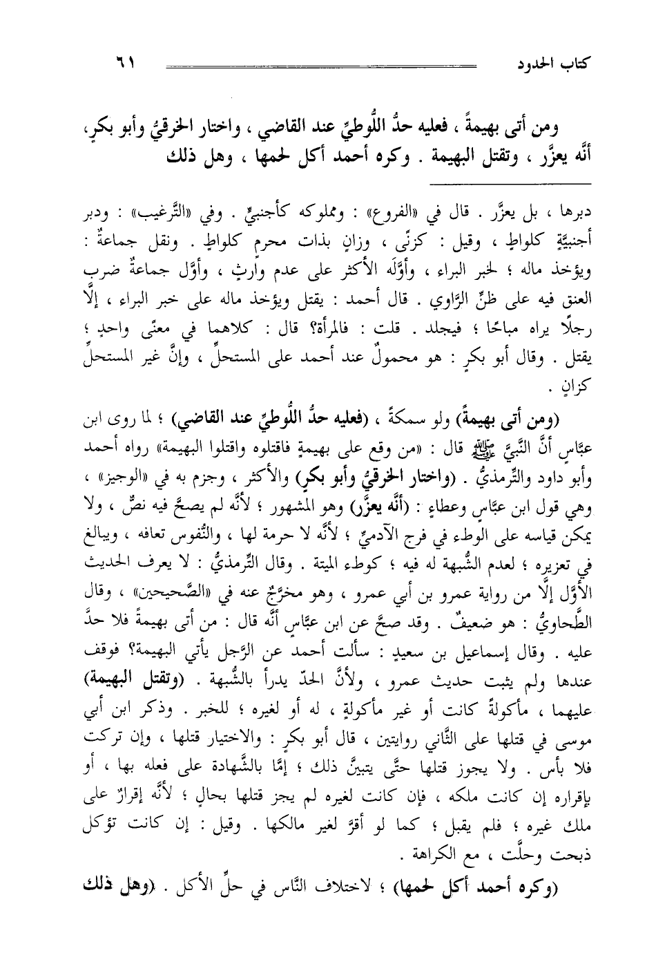 ومن أتى بهيمة فعليه حد اللوطي عند القاضي اختار الخرقي وأبو بكر أنه يعزر وتقتل البهيمة وكره أحمد أكل لحمها وهل ذلك