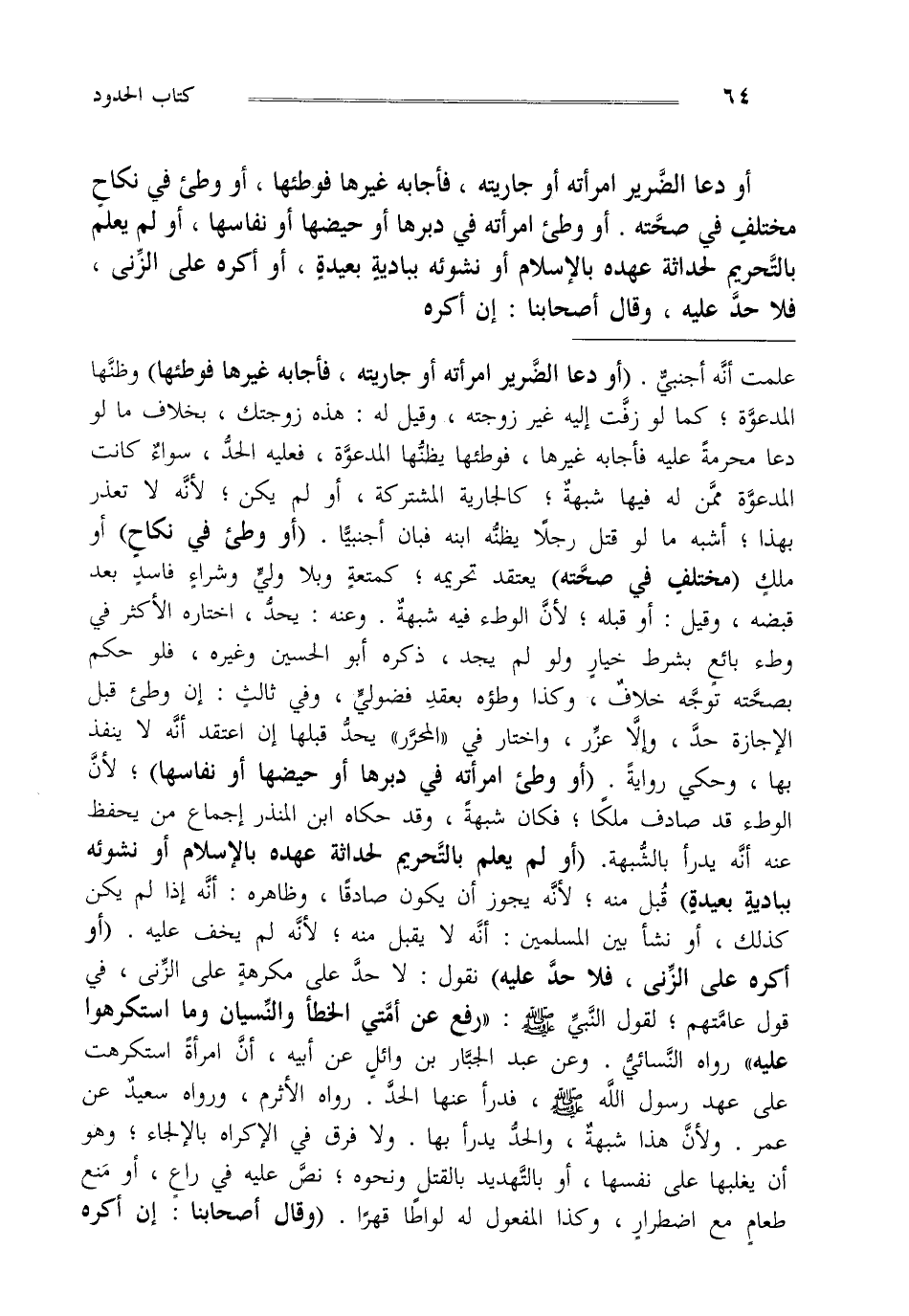 علمت أنه أجنبي "أو دعا الضرير امرأته أو جاريته فأجابه غيرها فوطئها" وظنها المدعوة كما لو زفت إليه غير زوجته وقيل له هذه زوجتك بخلاف ما لو دعا محرمة عليه فأجابه غيرها فوطئها يظنها المدعوة فعليه الحد سواء كانت المدعوة ممن له فيها شبهة كالجارية المشتركة أو لم يكن لأنه لا تعذر بهذا أشبه ما لو قتل رجلا يظنه ابنه فبان أجنبيا "أو وطئ في نكاح" أو ملك "مختلف في صحته" يعتقد تحريمه كمتعة وبلا ولي وشراء فاسد بعد قبضه وقيل أو قبله لأن الوطء فيه شبهة وعنه يحد اختاره الأكثر في وطء بائع بشرط خيار ولو لم يجد ذكره أبو الحسين وغيره فلو حكم بصحته توجه خلاف وكذا وطؤه بعقد فضولي وفي ثالث إن وطئ قبل الإجازة حد وإلا عزر واختار في المحرر يحد قبلها إن اعتقد أنه لا ينفذ بها وحكى رواية "أو وطئ امرأته في دبرها أو حيضها أو نفاسها" لأن الوطء قد صادف ملكا فكان شبهة وقد حكاه ابن المنذر إجماع من يحفظ عنه أنه يدرأ بالشبهة "أو لم يعلم بالتحريم لحداثة عهده بالإسلام أو نشوئه ببادية بعيدة" قبل منه لأنه يجوز أن يكون صادقا وظاهره أنه إذا لم يكن كذلك أو نشأ بين المسلمين أنه لا يقبل منه لأنه لم يخف عليه "أو أكره على الزنى فلا حد عليه" نقول لا حد على مكرهة على الزنى في قول عامتهم لقول النبي صلى الله عليه وسلم "رفع عن أمتي الخطأ والنسيان وما استكرهوا عليه" رواه النسائي وعن عبد الجبار بن وائل عن أبيه "أن امرأة استكرهت على عهد رسول الله صلى الله عليه وسلم فدرأ عنها الحد" رواه الأثرم ورواه سعيد عن عمر ولأن هذا شبهة والحد يدرأ بها ولا فرق في الإكراه بالإلجاء وهو أن يغلبها على نفسها أو بالتهديد بالقتل ونحوه نص عليه في راع أو منع طعام مع اضطرار وكذا المفعول له لواطا قهرا "وقال أصحابنا إن أكره