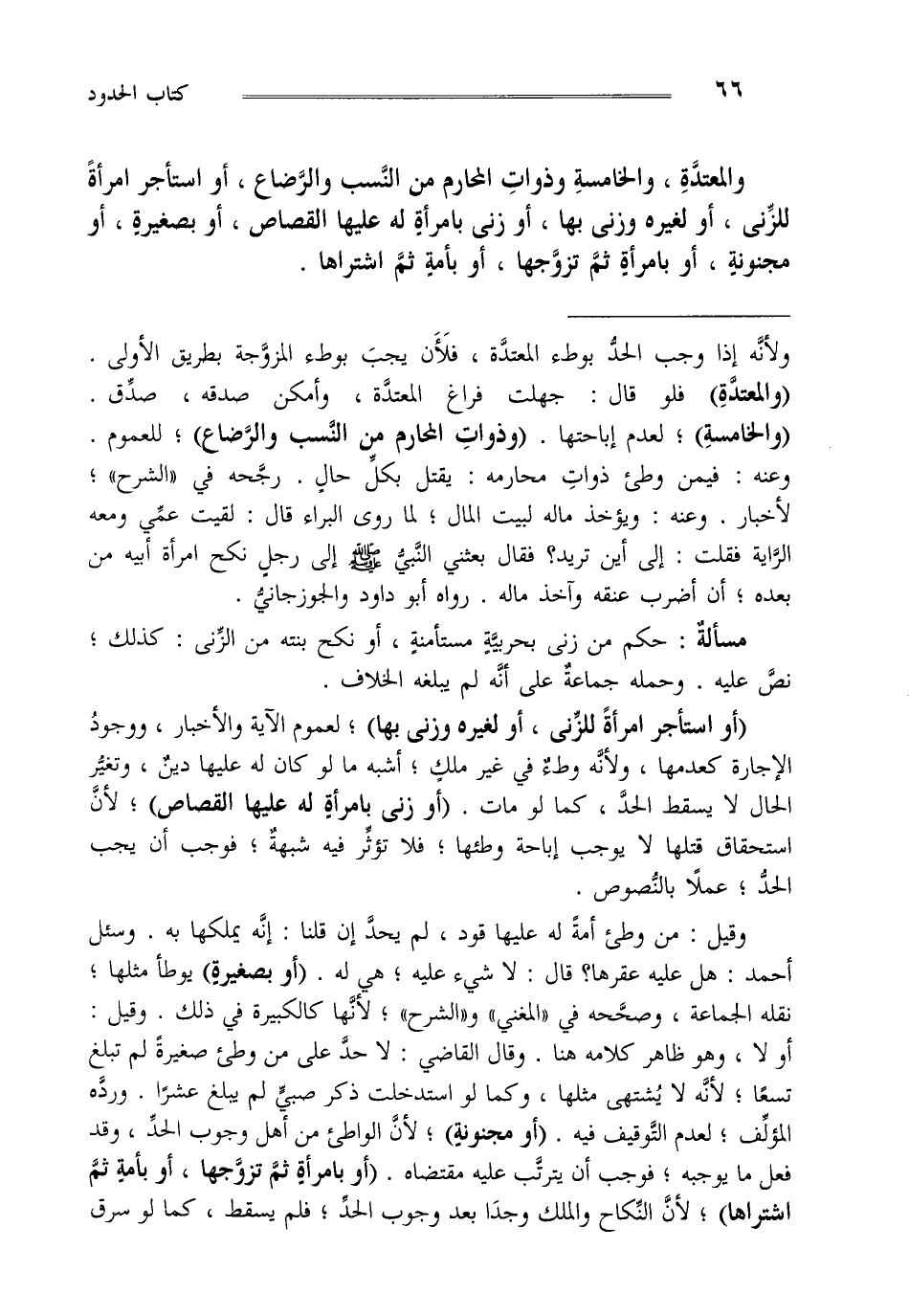 وقيل: من وطئ أمة له عليها قود لم يحد إن قلنا إنه يملكها به وسئل أحمد هل عليه عقرها قال لا شيء عليه هي له "أو بصغيرة" يوطأ مثلها نقله الجماعة وصححه في المغني والشرح لأنها كالكبيرة في ذلك وقيل أو لا وهو ظاهر كلامه هنا وقال القاضي لا حد على من وطئ صغيرة لم تبلغ تسعا لأنه لا يشتهى مثلها وكما لو استدخلت ذكر صبي لم يبلغ عشرا ورده المؤلف لعدم التوقيف فيه "أو مجنونة" لأن الواطئ من أهل وجوب الحد وقد فعل ما يوجبه فوجب أن يترتب عليه مقتضاه "أو بامرأة ثم تزوجها أو بأمة ثم اشتراها" لأن النكاح والملك وجدا بعد وجوب الحد فلم يسقط كما لو سرق