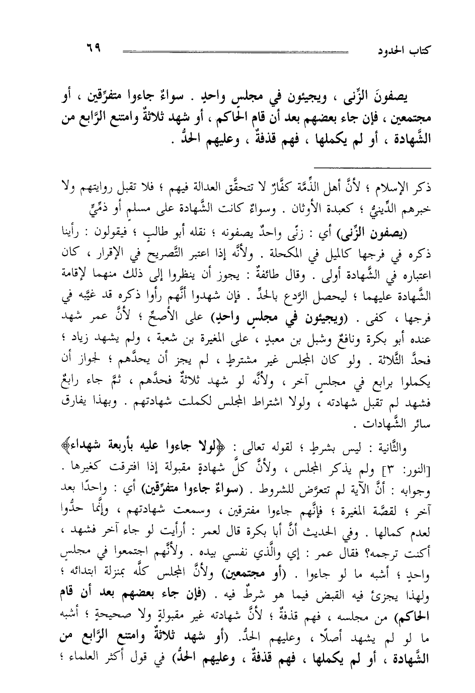 يصفون الزنا ويجيئون في مجلس واحد سواء جاءوا متفرقين أو مجتمعين فإن جاء بعضهم بعد أن قام الحاكم أو شهد ثلاثة وامتنع الرابع من الشهادة أو لم يكملها فهم قذفة وعليهم الحد