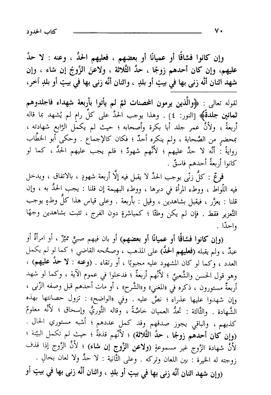 فرع: كل زنى يوجب الحد لا يقبل فيه إلا أربعة شهود بالاتفاق ويدخل فيه اللواط ووطء المرأة في دبرها ووطء البهيمة إن قلنا يجب الحد به وإن قلنا يعزر فيقبل بشاهدين وقيل بأربعة وعلى قياس هذا كل وطء يوجب التعزير فقط فإن لم يكن وطئا كمباشرة دون الفرج تثبت بشاهدين وجها واحدا "وإن كانوا فساقا أو عميانا أو بعضهم" أو بان فيهم صبي مميز أو امرأة أو عبد ولم يقبله "فعليهم الحد" على المذهب وصححه القاضي كما لو لم يكمل العدد وكما لو كان المشهود عليه مجبوبا أو رتقاء "وعنه: لا حد عليهم" وهو قول الحسن والشعبي لأنهم أربعة فدخلوا في عموم الآية وكما لو شهد أربعة مستورون ذكره في المغني والشرح أو مات أحدهم قبل وصفه الزنى وإن شهدوا عليها عذراء نص عليه وفي الواضح تزول حصانتها بهذه الشهادة والثالثة تحد العميان خاصة وقاله الثوري وإسحاق لأنه معلوم كذبهم والباقي يجوز صدقهم وقد كمل عددهم أشبه مستوري الحال "وإن كان أحدهم زوجا حد الثلاثة" لأنهم قذفة حيث لم تكمل البينة لأن شهادة الزوج غير مسموعة "ولاعن الزوج إن شاء" لأن الزوج إذا قذف زوجته له الخيرة بين اللعان وتركه وعلى الثانية لا حد ولا لعان بحال.