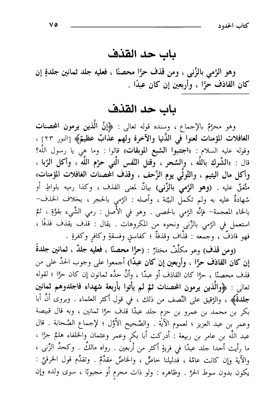 وهو الرمي بالزنا ومن قذف حرا محصنا فعليه جلد ثمانين جلدة إن كان القاذف حرا و أربعين إن كان عبدا.