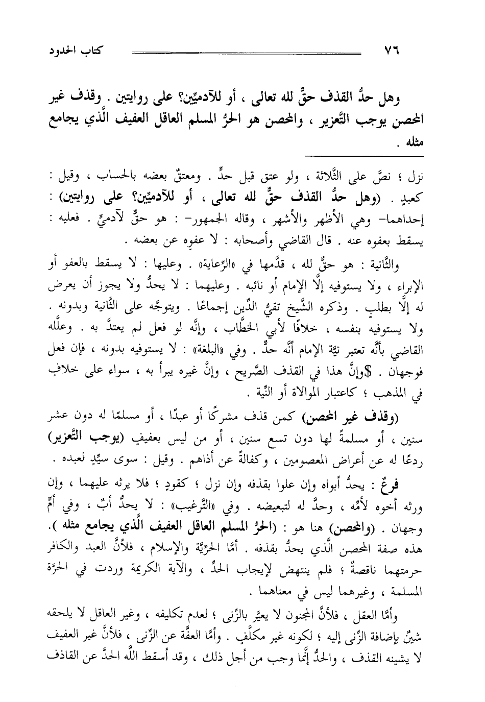 وهل حد القذف حق لله تعالى أو للآدميين؟ على روايتين,وقذف غير المحصن يوجب التعزير والمحصن هو الحر المسلم العاقل العفيف الذي يجامع مثله.