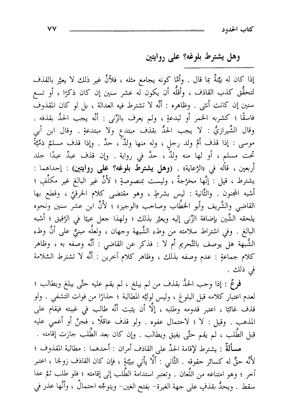 مسألة: يشترط لإقامة الحد على القاذف أمران أحدهما مطالبة المقذوف لأنه حق له كسائر حقوقه الثاني ألا يأتي ببينة فإن كان القاذف زوجا اعتبر آخر وهو امتناعه من اللعان وتعتبر استدامة الطلب إلى إقامته فلو طلب ثم عفا سقط ويحد بقذف على جهة الغيرة بفتح الغين ويتوجه احتمال وأنها عذر في