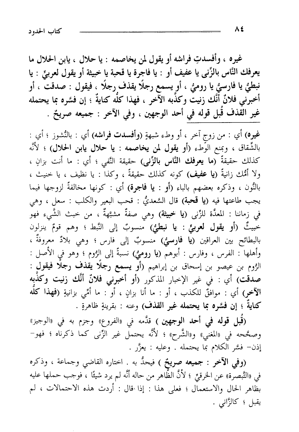 غيره" أي: من زوج آخر أو وطء شبهة "وأفسدت فراشه" أي بالنشوز أي بالشقاق وبمنع الوطء "أو يقول لمن يخاصمه يا حلال يا ابن الحلال" لأنه كذلك حقيقة "ما يعرفك الناس بالزنى" حقيقة النفي أي ما أنت بزان ولا أمك زانية "يا عفيف" كونه كذلك حقيقة وكذا يا نظيف يا خنيث بالنون وذكره بعضهم بالباء "أو يا فاجرة" أي كونها مخالفة لزوجها فيما يجب طاعتها فيه يا قحبة قال السعدي قحب البعير والكلب سعل وهي في زماننا المعدة للزنى "يا خبيثة" وهي صفة مشبهة من خبث الشيء فهو خبيث "أو يقول لعربي يا نبطي" منسوب إلى النبط وهم قوم ينزلون بالبطائح بين العراقين "يا فارسي" منسوب إلى فارس وهي بلاد معروفة وأهلها الفرس وفارس أبوهم " يا رومي" نسبة إلى الروم وهو في الأصل الروم بن عيصو بن إسحاق بن إبراهيم "أو يسمع رجلا يقذف رجلا فيقول صدقت" أي في غير الإخبار المذكور "أو أخبرني فلان أنك زنيت وكذبه الآخر" أي موافق للكذب أو ما أنا بزان أو ما أمي بزانية "فهذا كله كناية إن فسره بما يحتمله غير القذف" وعنه بقرينة ظاهرة.