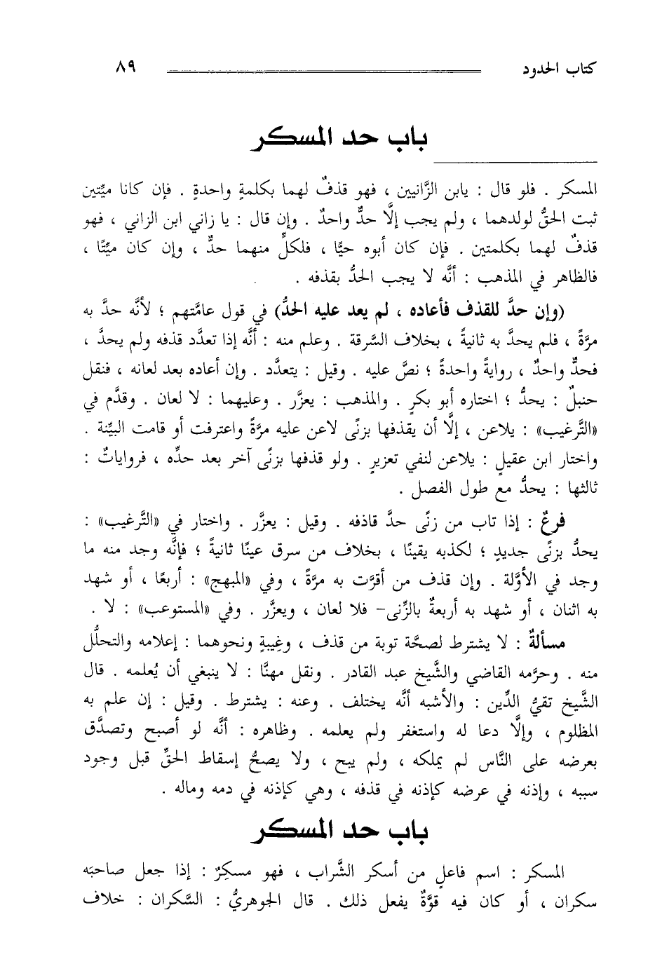 المسكر فلو قال يا ابن الزانيين فهو قذف لهما بكلمة واحدة فإن كانا ميتين ثبت الحق لولدهما ولم يجب إلا حد واحد وإن قال يا زاني ابن الزاني فهو قذف لهما بكلمتين فإن كان أبوه حيا فلكل منهما حد وإن كان ميتا فالظاهر في المذهب أنه لا يجب الحد بقذفه.