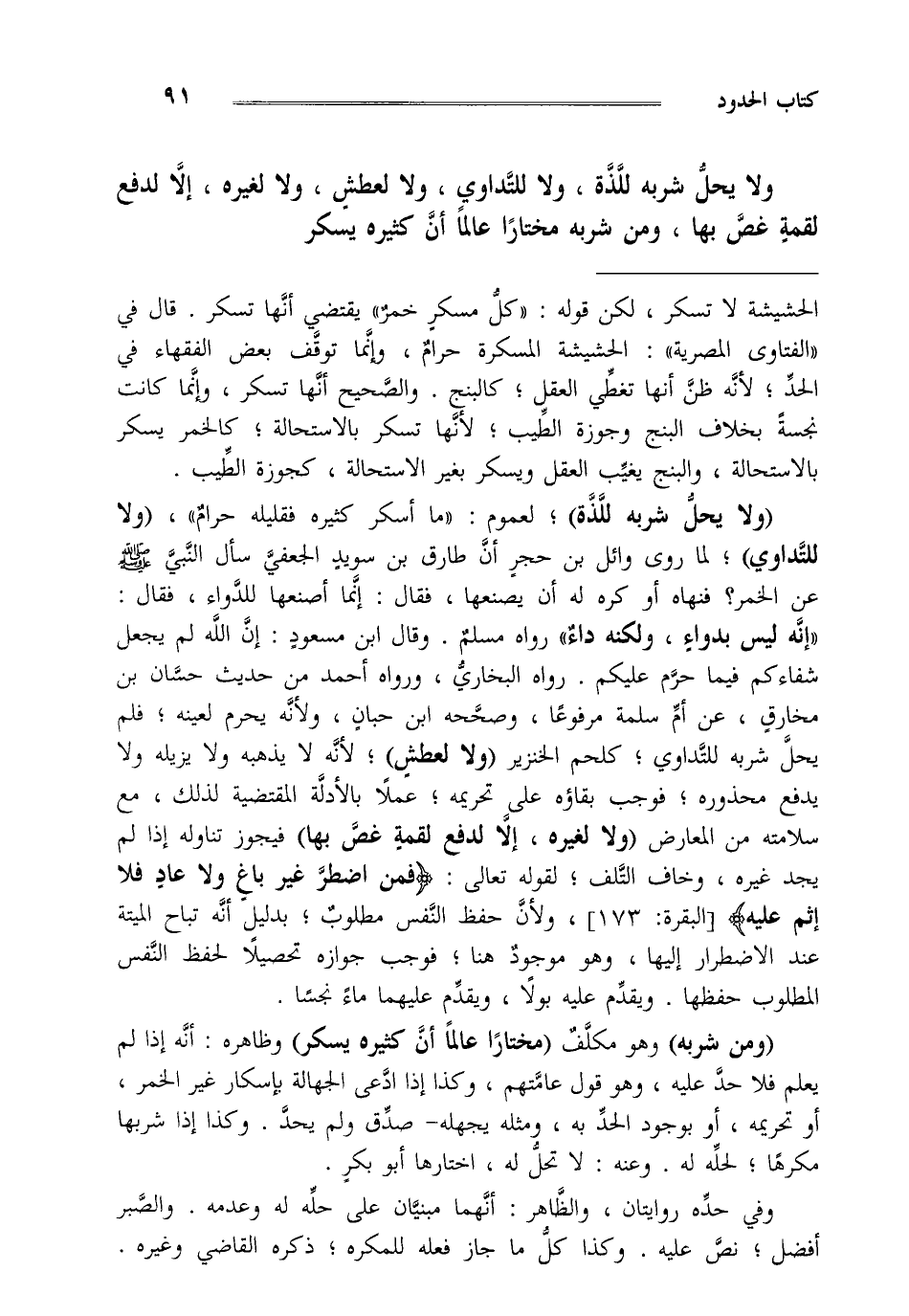 ولا يحل شربه للذة ولا للتداوي ولا لعطش ولا لغيره إلا لدفع لقمة غص بها ومن شربه مختارا عالما أن كثيره يسكر